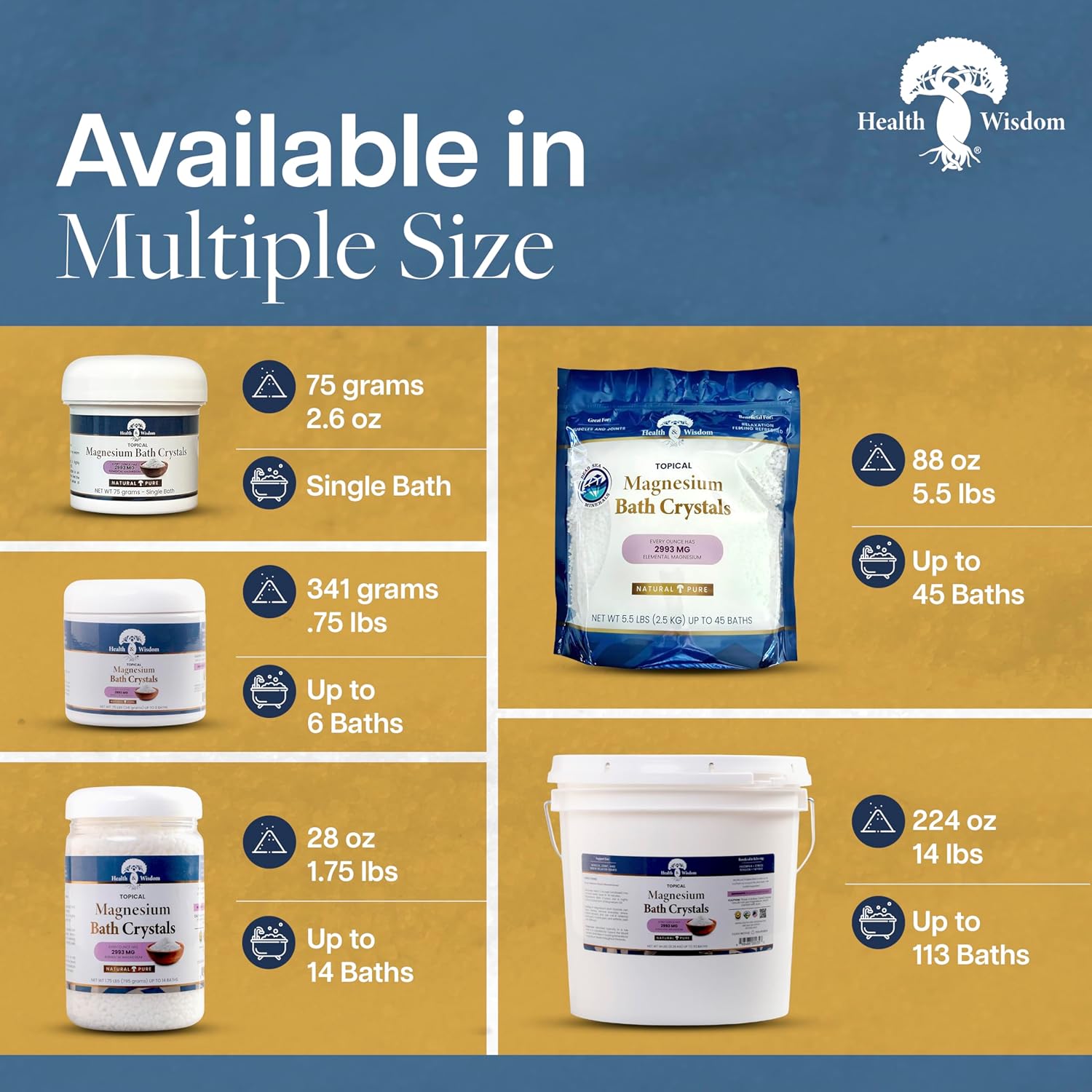 Health and Wisdom Magnesium Bath Crystals - Bath Salts with High Concentration & Enhanced Absorption for Muscle & Joint Relief - Dead Sea Sourced - Unscented - .75 lbs - Up to 6 Uses