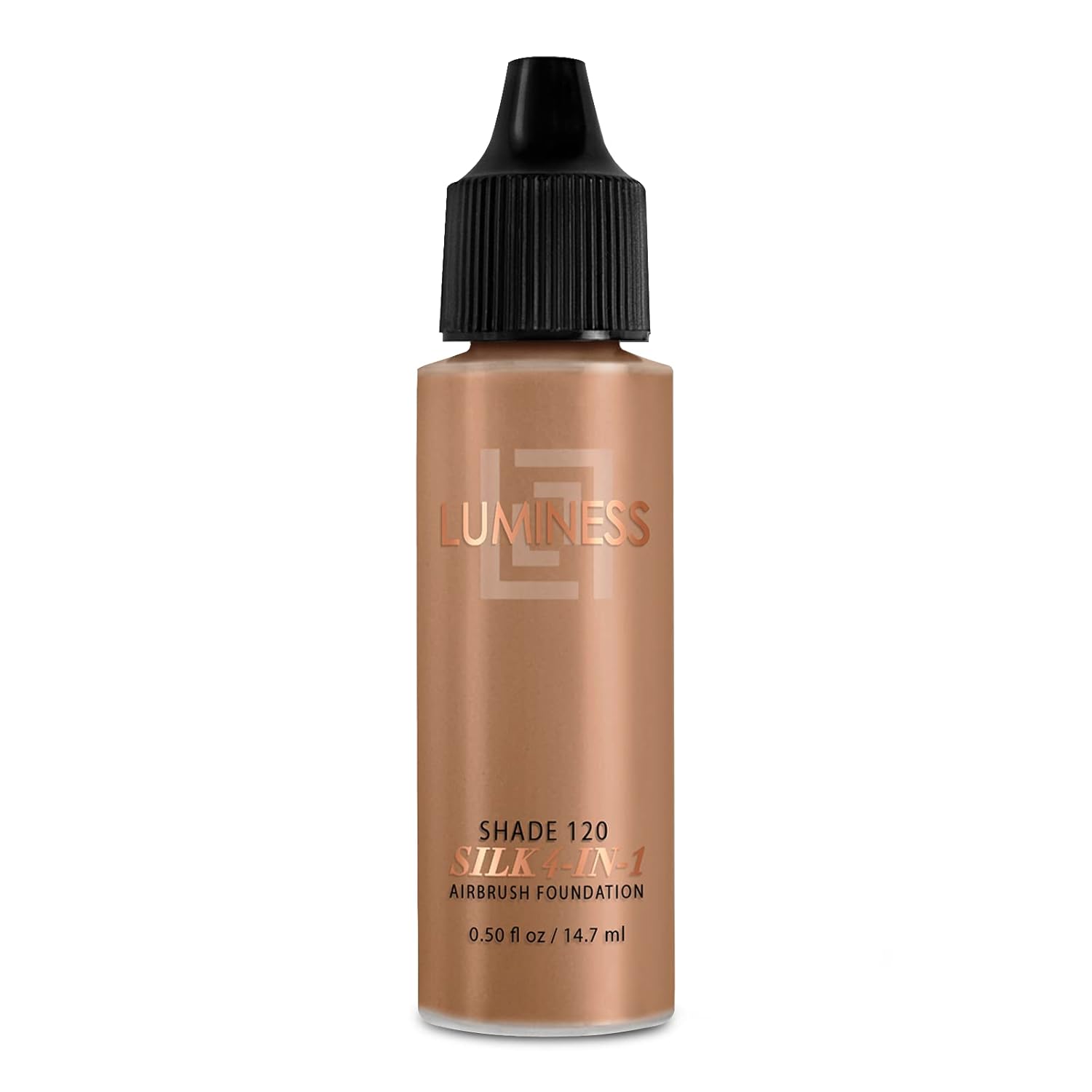- Lightweight Coverage with a Natural Satin Finish: LUMINESS SILK 4-in-1 Airbrush Foundation combines an anti-aging serum, primer, high-coverage concealer, and all-day foundation into one. Provides 12-18 hours of water-resistant wear. 0.5-oz bottle in Shade 120.