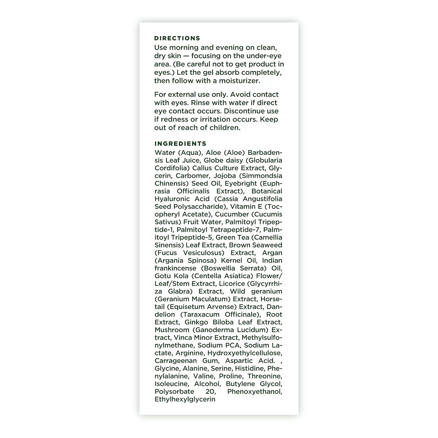 - Directions: Apply morning and evening on clean, dry skin — focusing on the under-eye area. (Be careful not to get product in eyes.) Let the gel absorb completely, then follow with a moisturizer.