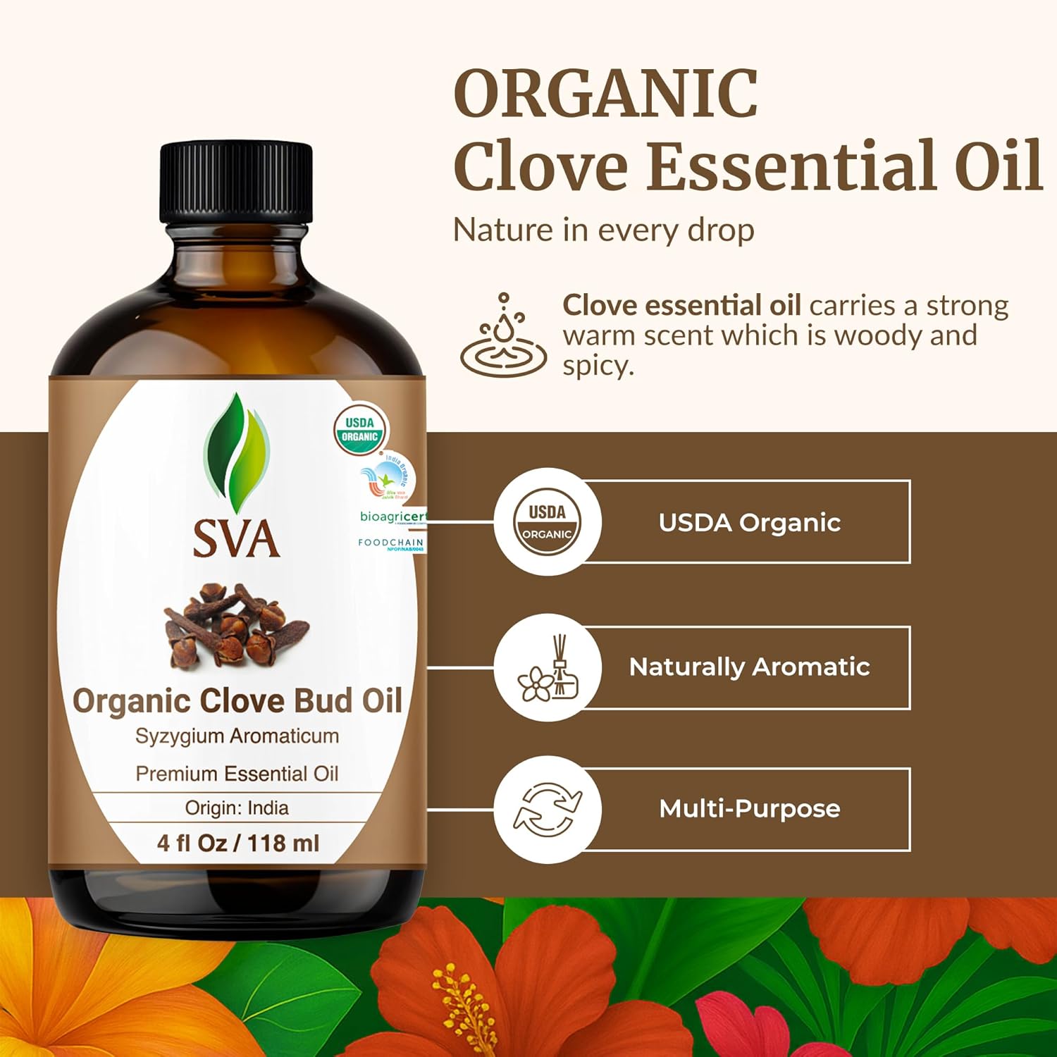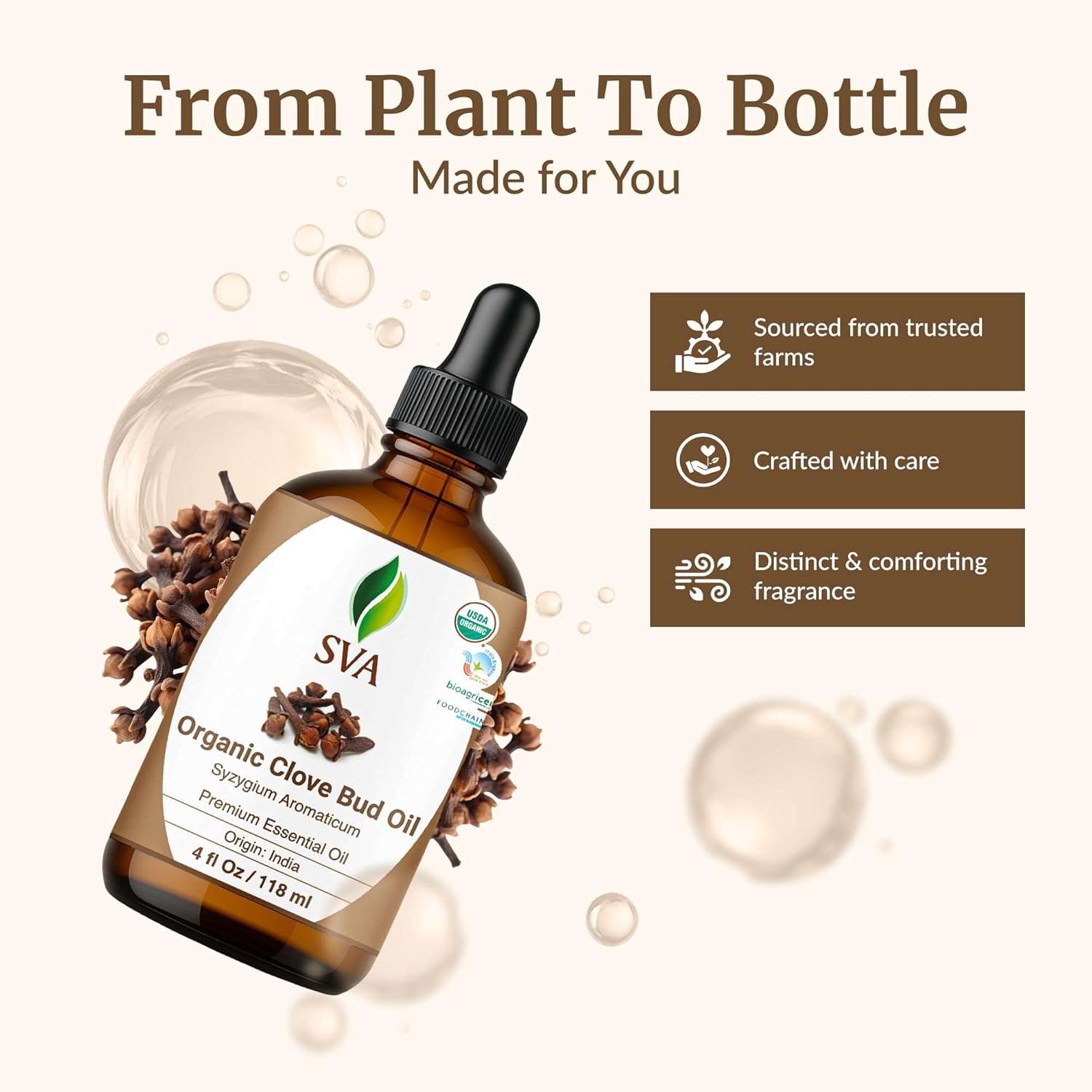 - Premium Quality Organic Clove Bud Essential Oil: SVA Organic Clove Bud Oil essential oil 4oz is obtained by steam distillation of Syzygium aromaticum L. bud. Our Clove Bud oil is free of preservatives and comes with a dropper for easy application. It is not tested on Animals. We care for you!