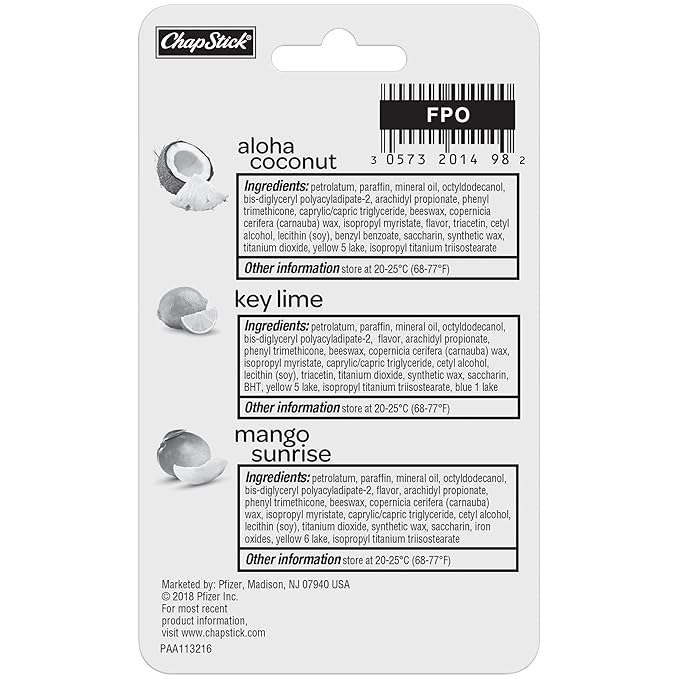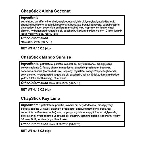 - One variety pack of three 0.15-ounce ChapStick Tropical Paradise Collection Mango, Lime and Coconut Lip Balm Tubes Variety Pack for Lip Care