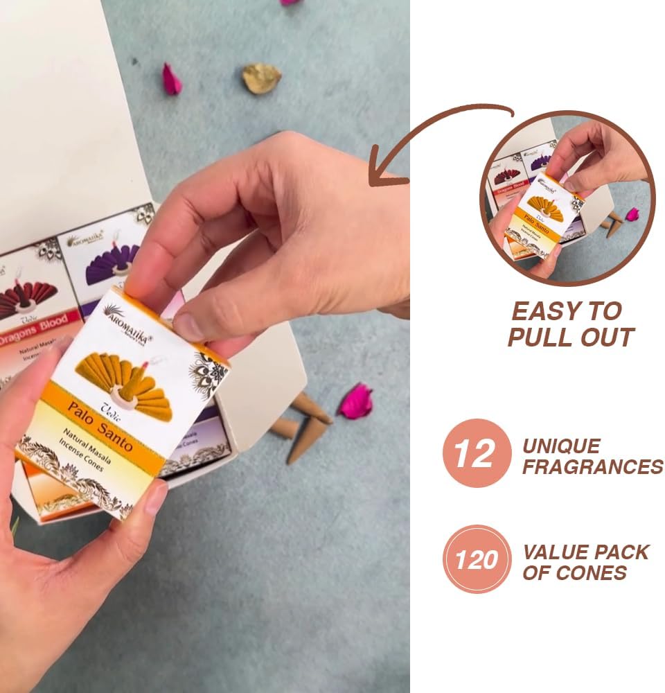 - 12 ASSORTED INCENSE CONES: This set includes hand-rolled incense cones from India, crafted using traditional techniques. This set includes 12 boxes, each with 10 dhoop incense cones, totaling 120 cones with a burn time of 25 minutes. These incense cones ensure a clean burn with no black smoke.