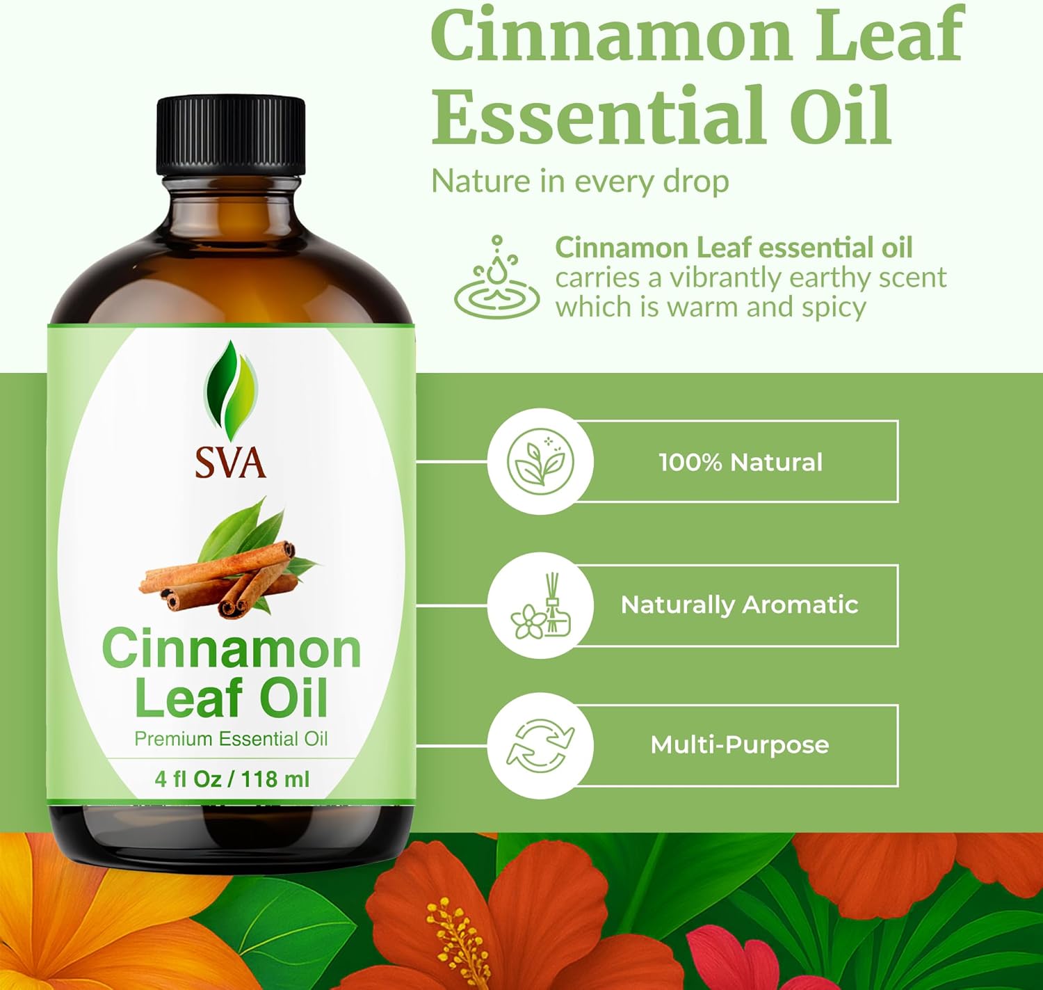 - PREMIUM QUALITY CINNAMON LEAF ESSENTIAL OIL: SVA Cinnamon Leaf essential oil 4oz is obtained by steam distillation of Cinnamomum Verum leaf. Our Cinnamon Leaf oil is free of preservatives and comes with a dropper for easy application. It is not tested on Animals. We care for you!