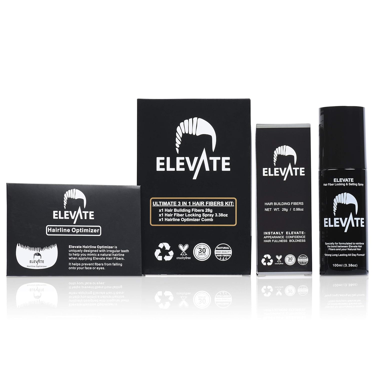 Elevate Hair Building Fibers 3-in-1 Kit for Thinning Hair (Black) Keratin Hair Thickening Powder with Fiber Lock Spray & Hairline Optimizer Comb - Instant Hair Concealer Waterproof for Men & Women