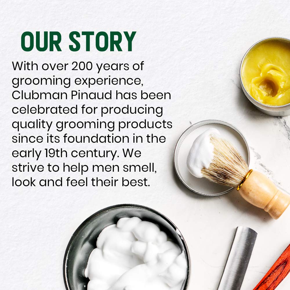 - MADE IN USA, CRUELTY-FREE, TRUSTED FOR GENERATIONS: With over 200 years of grooming experience, Clubman Pinaud is a trusted brand. Clubman has been celebrated for producing quality products since its foundation in the early 1800s. Men have been using their products for generations, while younger users are turning to their products for trusted grooming solutions with a sense of nostalgia, proving quality never goes out of style. All products are 100 % cruelty-free, proudly made in the USA.