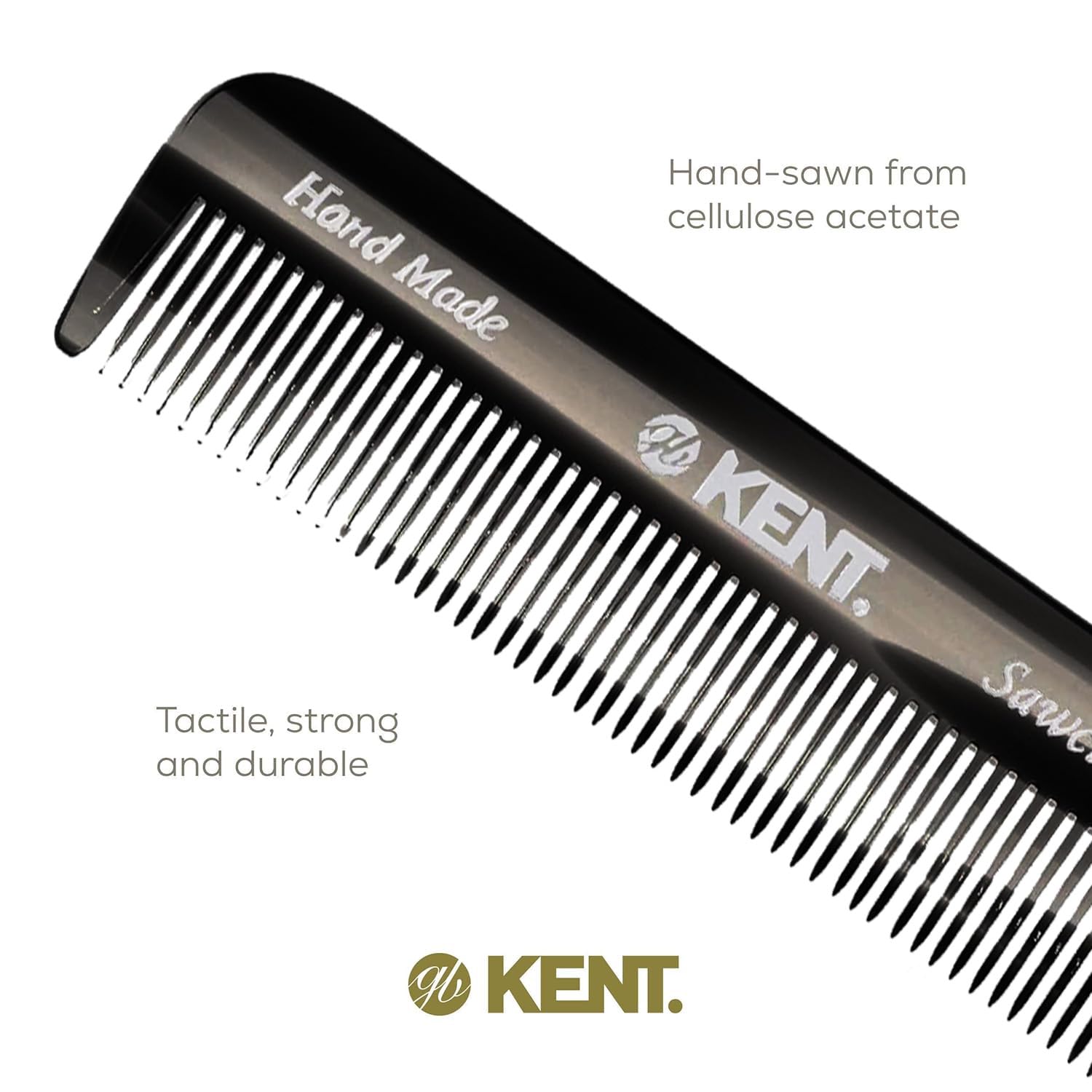 - Handmade from a large sheets of cellulose acetate rather than being molded. This material is tactile, flexible and strong, a non-petroleum based plastic derived from plants that has been found to create less static in hair, and is saw-cut to ensure a smooth surface that will not pull or snag hair follicles