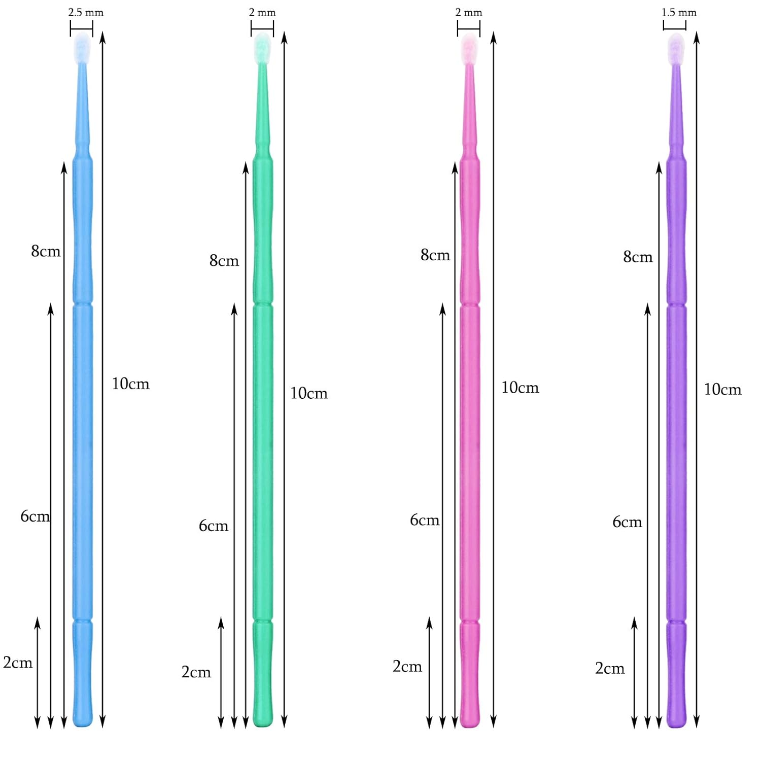 - Microfiber Tips And Plastic Handle; Length:10cm / 3.9”,Head Diameter: 1.5mm/Small Size(Dark Purple); Package Includes 500pcs Micro Brushes, And Every 100pcs In A Clear Plastic Bags Which Keeps Them Clean And Tidy.