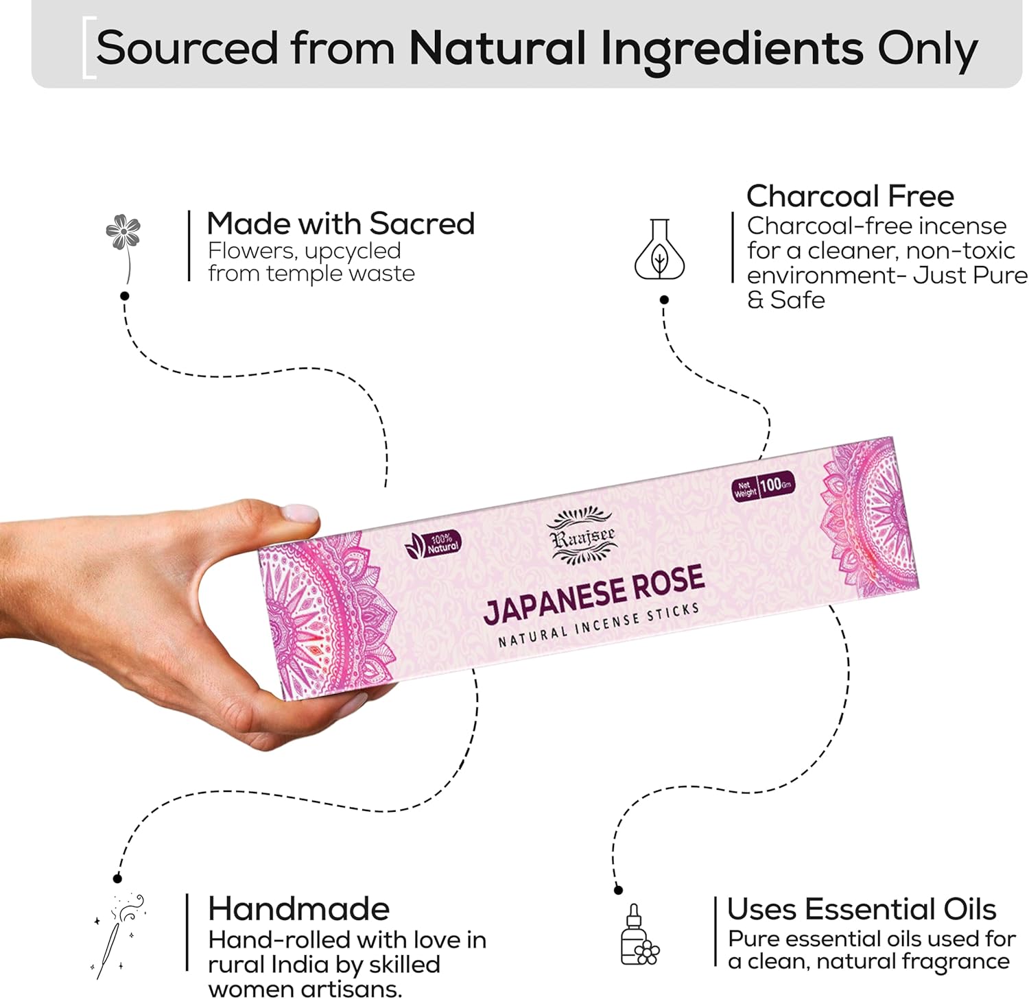 Raajsee Japanese Rose Incense Sticks (180 gm), 100% Pure Organic Natural Hand Rolled Free from Chemicals- Perfect for Aromatherapy, Cleansing, Meditation, and Church (Pack of 12)