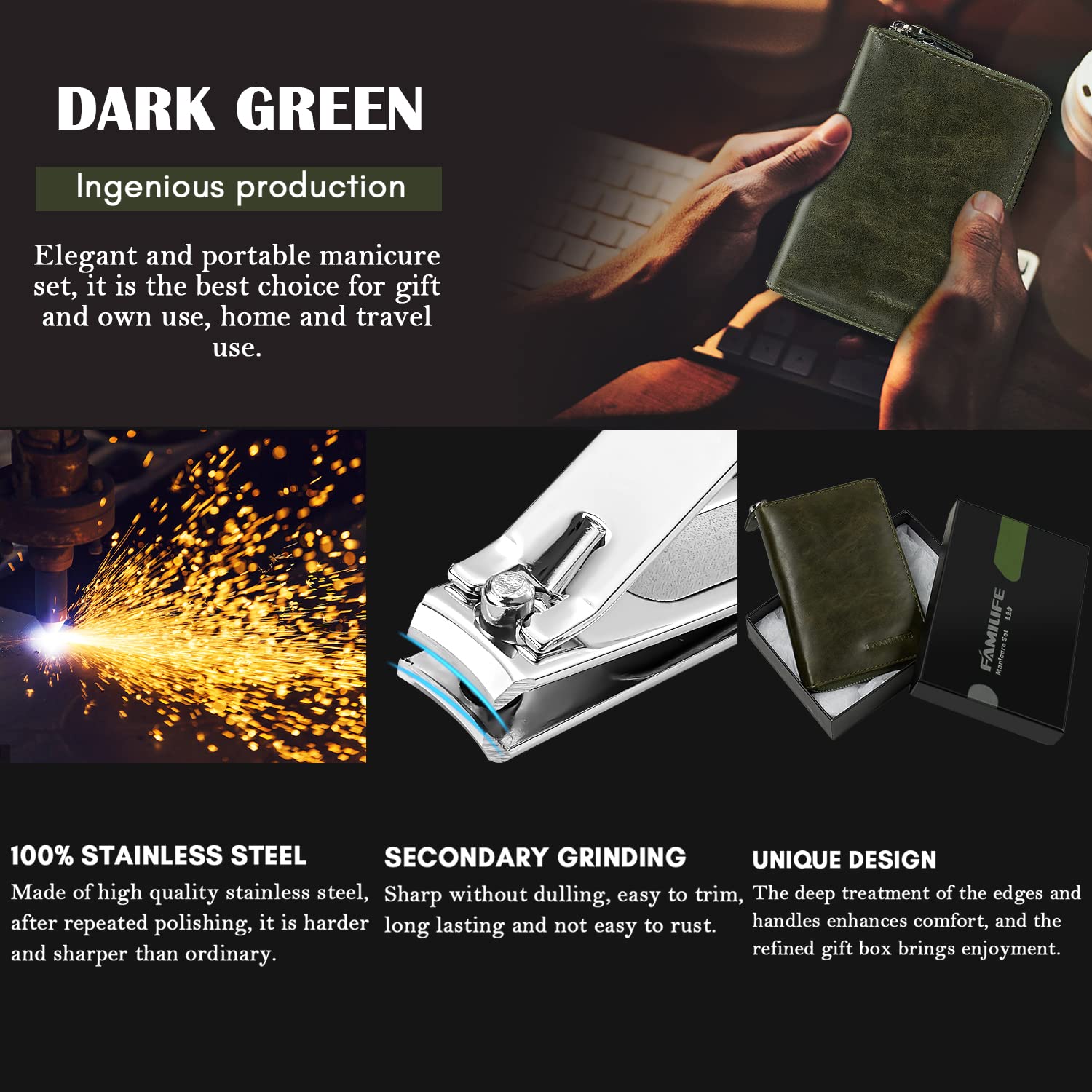 - Cloth To Protect Grooming Tools: The package of FAMILIFE manicure set is made of PU leather; each tool has a fixed slot to keep the tools in order; a piece of cloth is in the middle, the tools will not rub against each other when the packaging is closed; the nice design can protect the tools perfectly