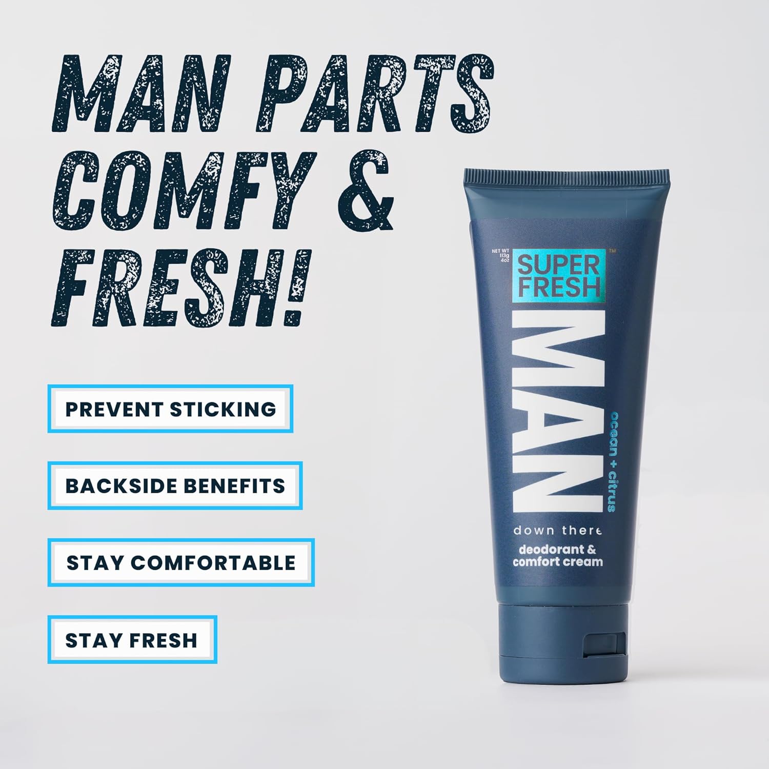- PREVENT SWAMPY STICKY SMELLY MAN PARTS: Take control of daily discomfort caused by heat, humidity, and sweat with this moisturizing hygiene lotion designed specifically for men’s groin, balls, and buttocks. Super Fresh delivers targeted freshness by stopping stickiness and odor before it starts, so you stay dry, confident, and irritation-free whether you're working, exercising, or just getting through a hot day.
