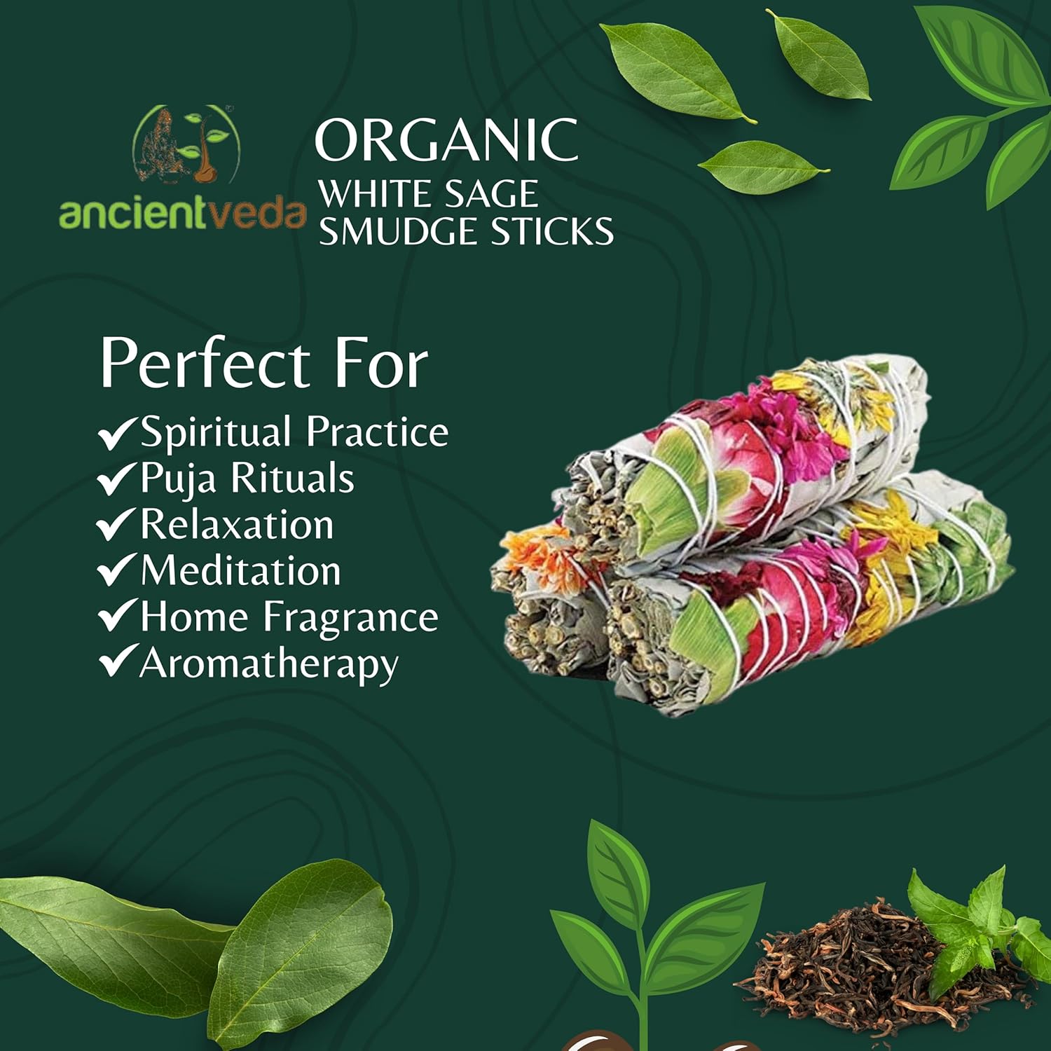 Joy Organic White Sage Smudge Sticks with Flowers for Cleansing Home, Meditation, Yoga, Healing and Smudging | Sustainably Sourced California White Sage Bundles (3 Pack - 9 Inch)