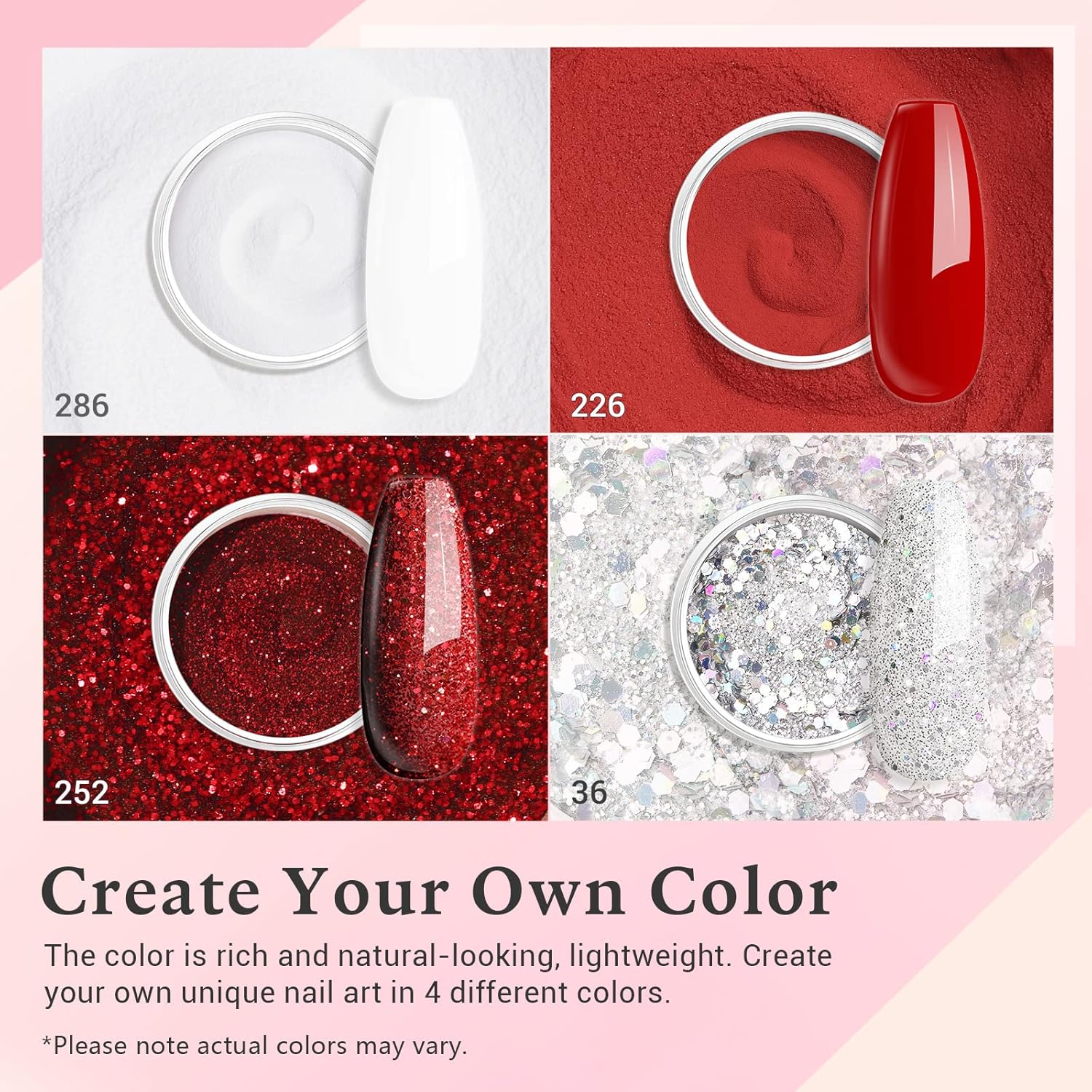 AZUREBEAUTY Dip Powder Nail Starter Kit Berry Red Milky White Silver Glitter, 4 Colors Dipping Powder Set, French Nail Art Base Top Coat Activator Essential Liquid Manicure No Lamp Needed Salon