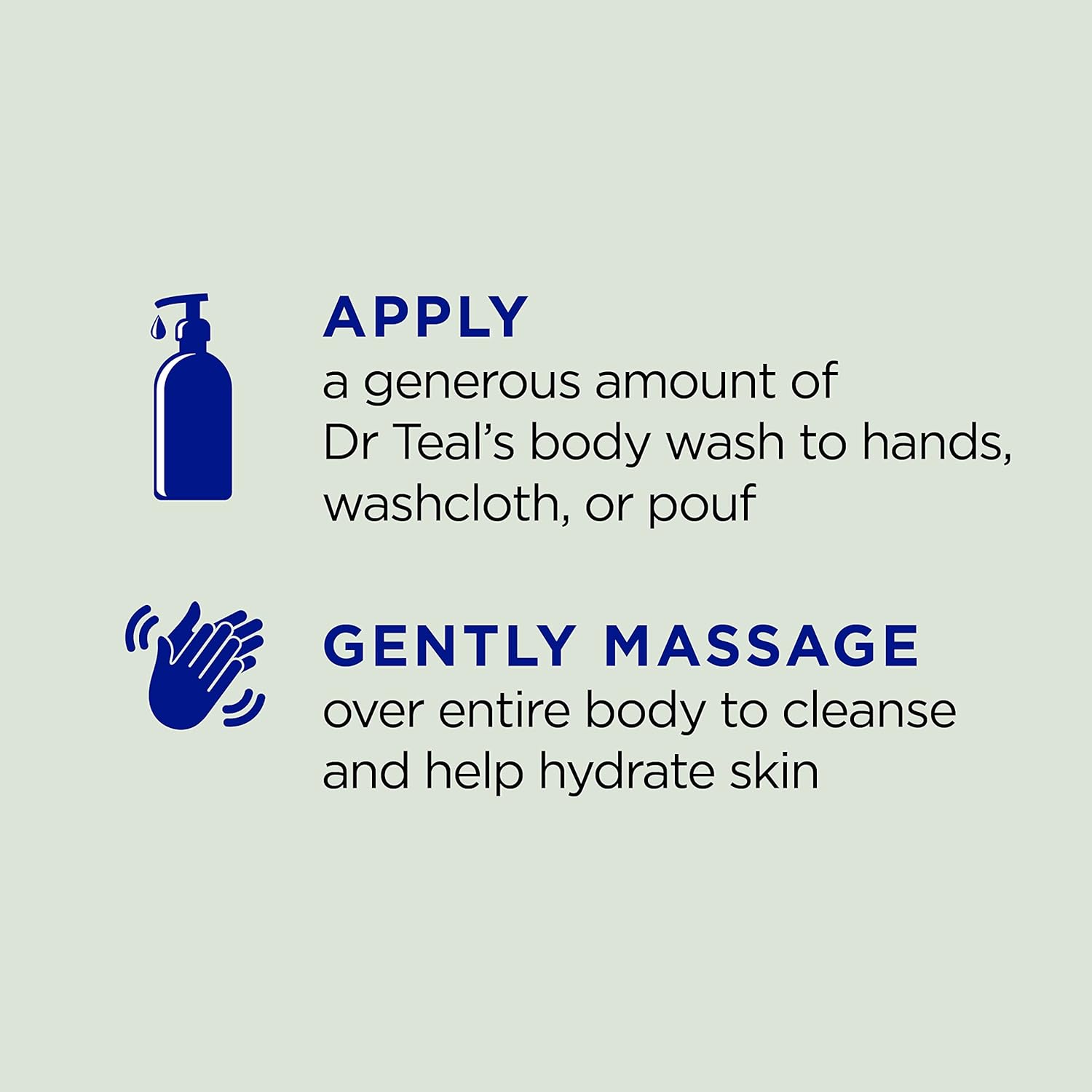- Apply a generous amount of Dr Teal’s body wash to hands, washcloth, or pouf, then gently massage all your body for ultra-moisture and total rejuvenation.