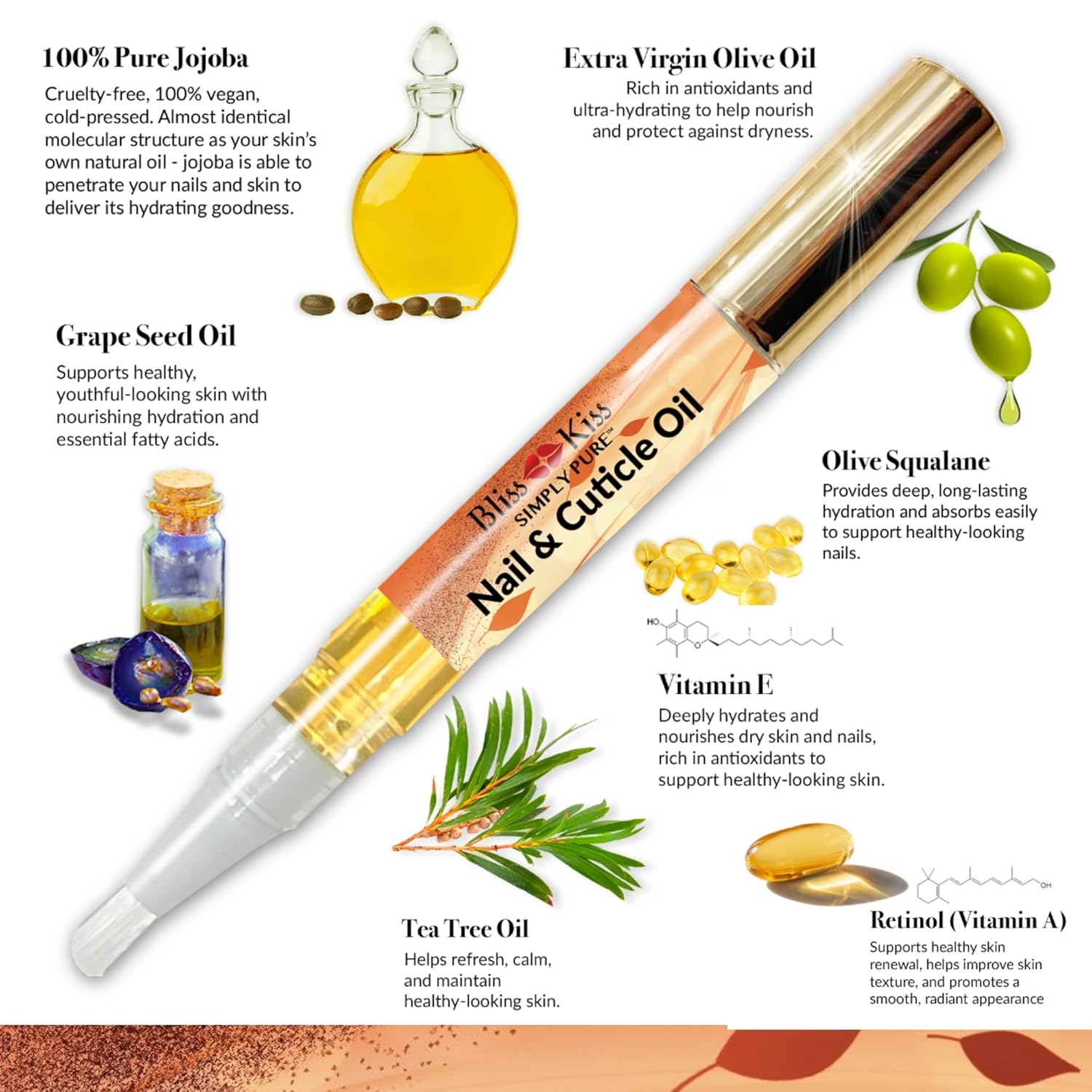 - Mess-Free, On-the-Go Application – The Bliss Kiss cuticle oil pen allows for precise, controlled nail strengthener and growth serum application without spills. Convenient nail growth oil for use at home, the office, or on the go.