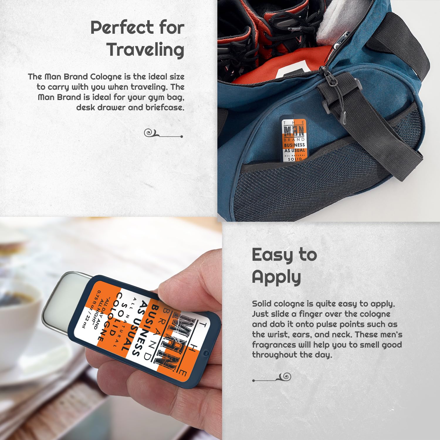 - Boosted Confidence and Masculine Appeal: Solid men’s cologne isn't just about smelling good; it's about feeling confident with our carefully curated fragrance for men.