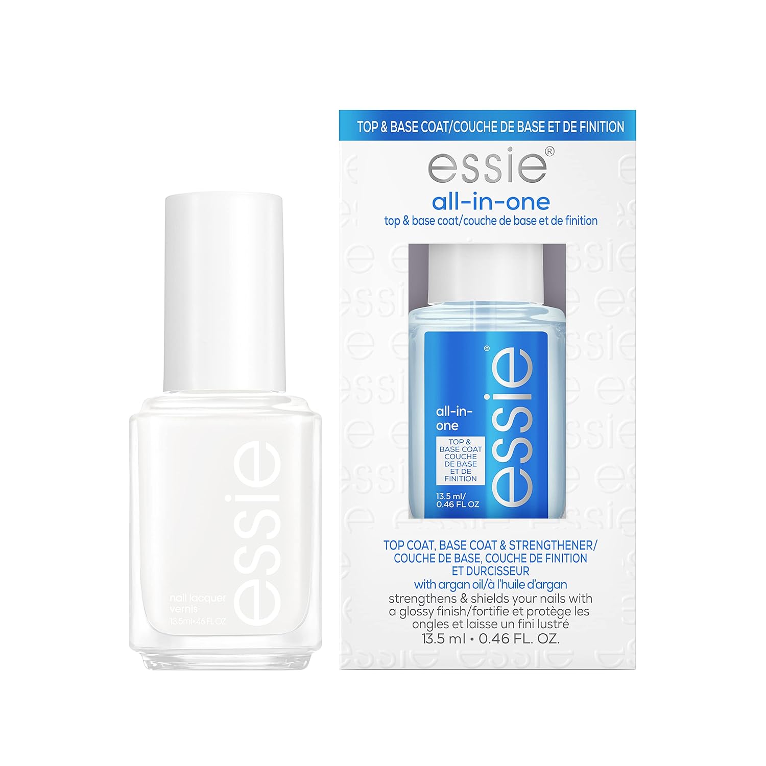 - essie Glossy Shine Manicure Kit - create the perfect glossy shine mani with this salon-quality nail color + All In One duo. Includes essie original nail color and a multi-use clear nail polish that can be used as a base coat, top coat, and strengthener all in one!