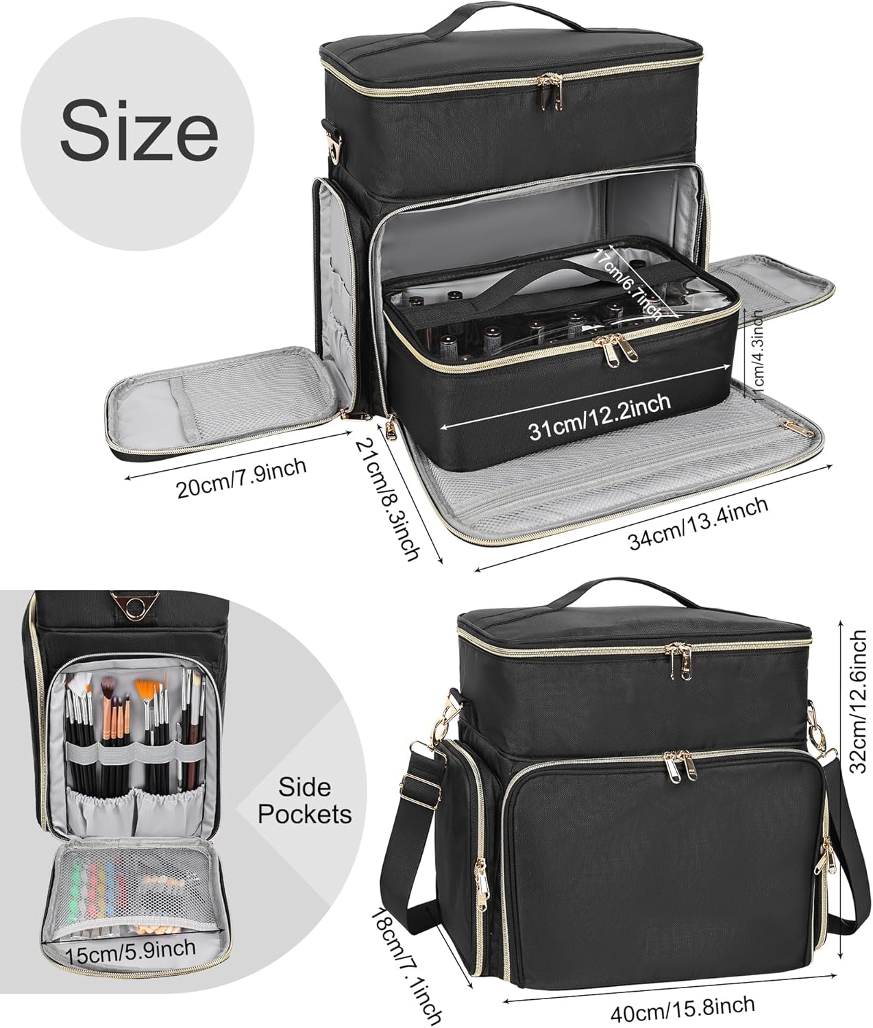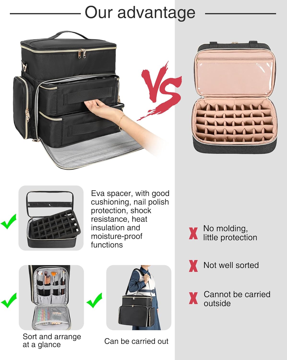 - Two Nail Polish Organizer Cases: The nail polish travel cases are large capacity, holds up to 64 bottles. The inner padded foam base design not only keeps your nail polish organized but protects thenm from messy, dust and accidental dropping.