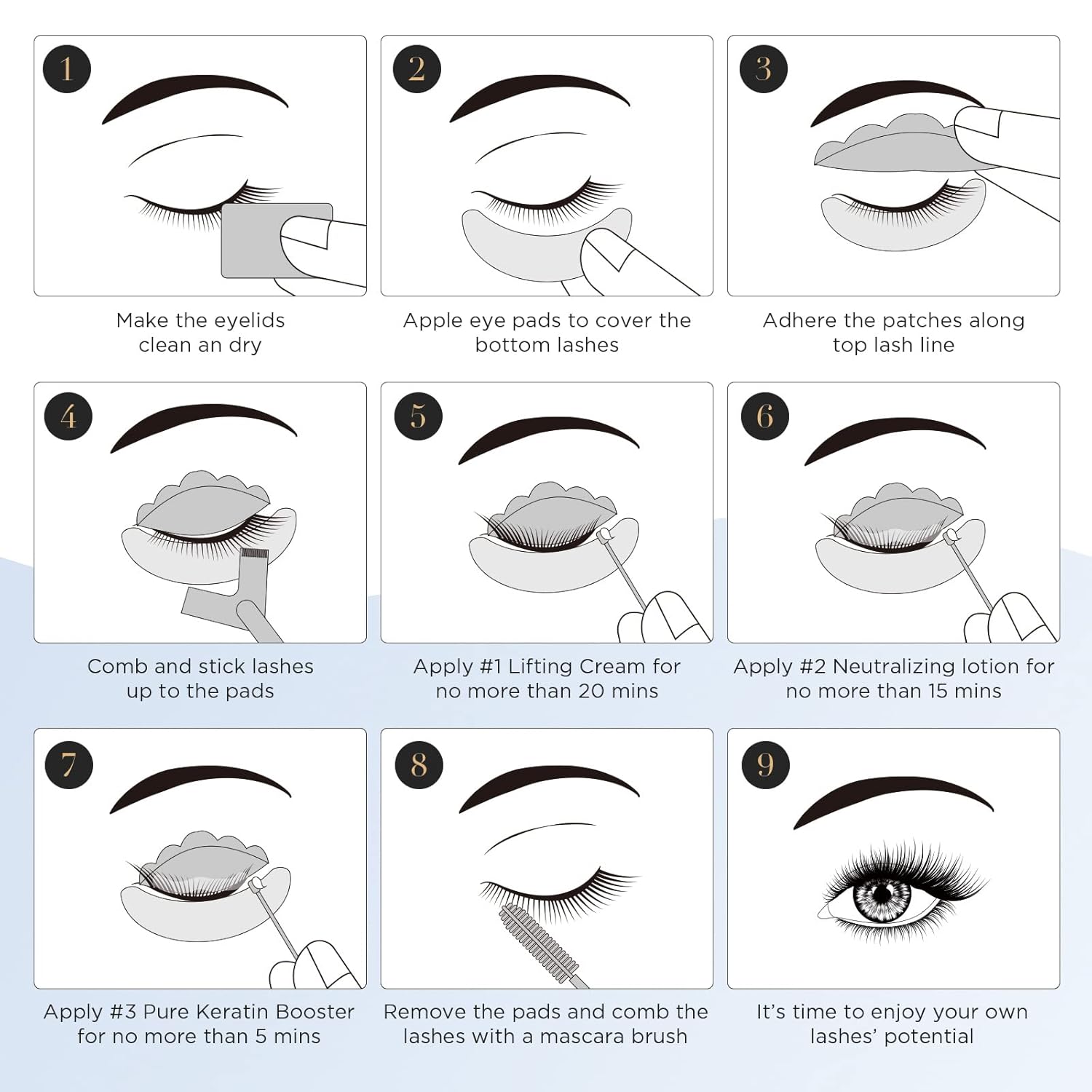 - 【ENOUGH FOR 10 APPLICATIONS】Lifting Cream *10pcs, Neutralizing Lotion *10pcs, Keratin Booster *10pcs, Lash Shields (S/M/L) *6pairs, 3-In-1 Wand *1pcs, 3D Eye Pads *10Pouches , Micro Brushes *25pcs, Mascara Brushes *15pcs, Ring Cups *50pcs