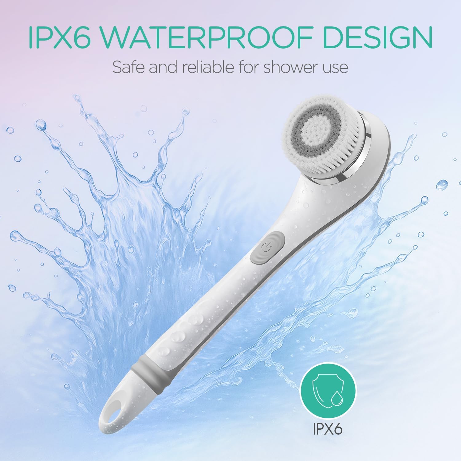 - IPX6 waterproof design - The machine uses rubberized silicone to ensure waterproof , allows conveniently using in shower. Ergonomically design, easy to grab. The long handle design allows you to easily clean hard-to-reach places. Non-slip design prevents it from falling off.