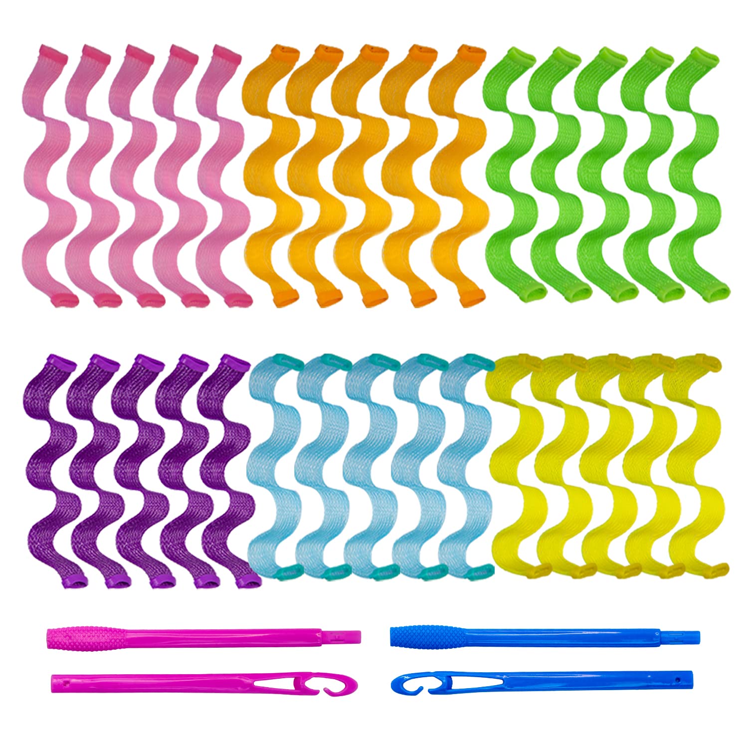 - Package includes: 30pcs wave style hair curlers.pink orange blue green yellow and purple color, 2 sets of hair hooks (blue + pink).