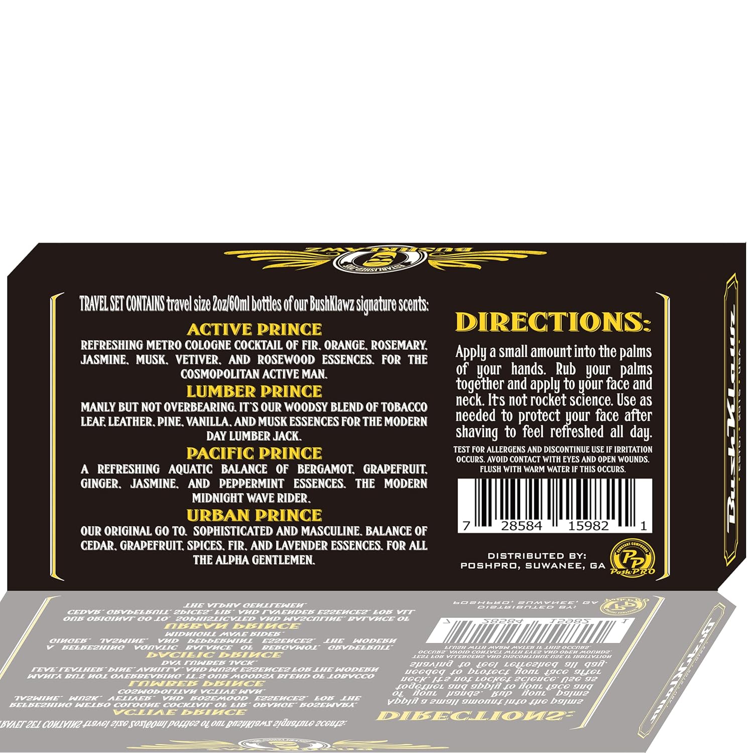 - Contains 2oz travel size sampler bottles of each of our famous BushKlawz Scents: Active, Lumber, Pacific, & Urban. If you can't decide on a scent, this is the go to.