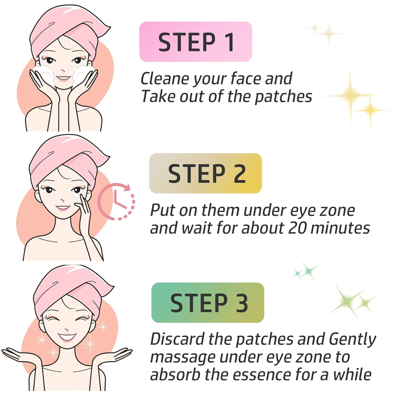 - EAST TO USE - Clean your face , take out the eye mask, apply it under your eye and enjoy 15~20 minutes At last, discard the mask and massage the essence untill absorbed.