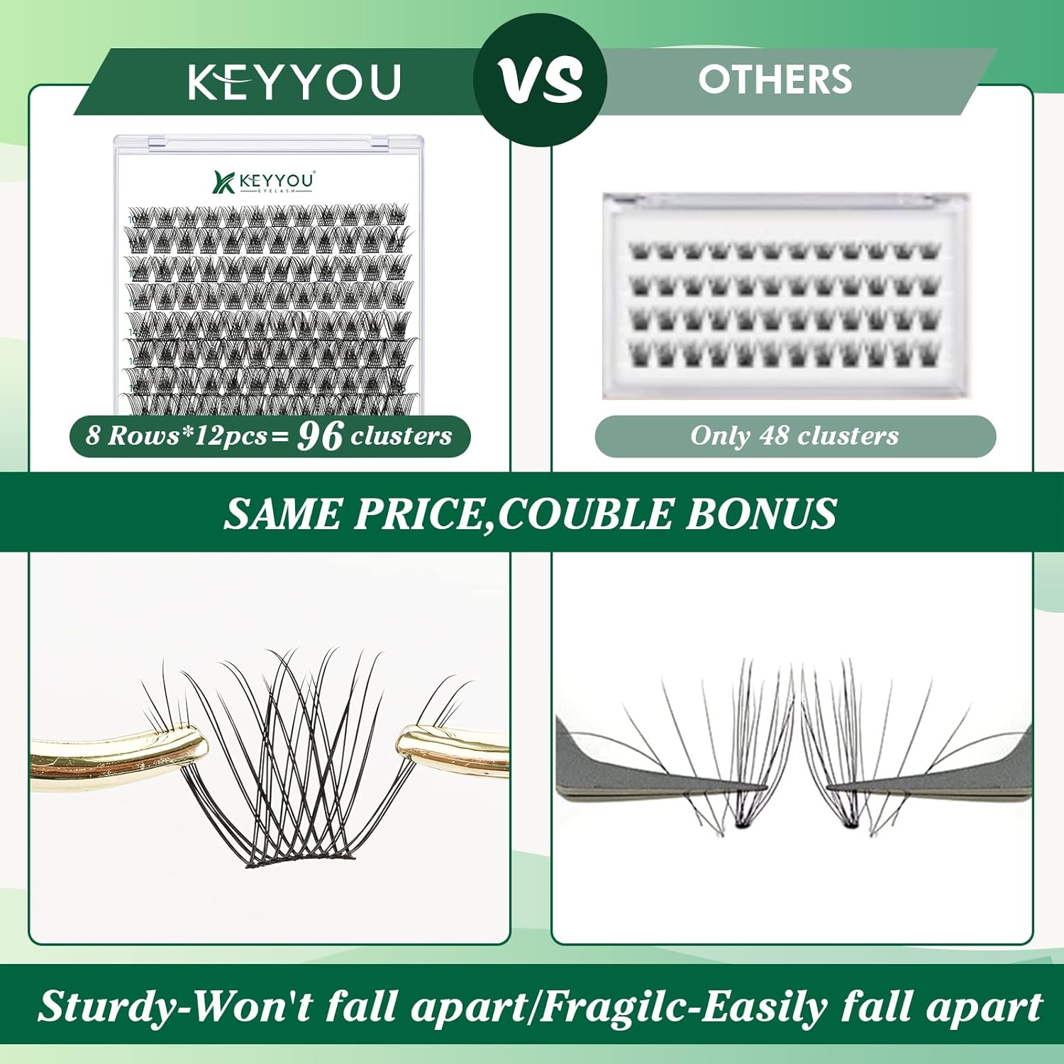 - 【Soft&Comfortable】KEYYOU lash cluster are made of imported materials,the stem line is thinner and softer, the eyelash cluster are lighter and more comfortable to wear.96 clusters in one tray ,more cost-effective.
