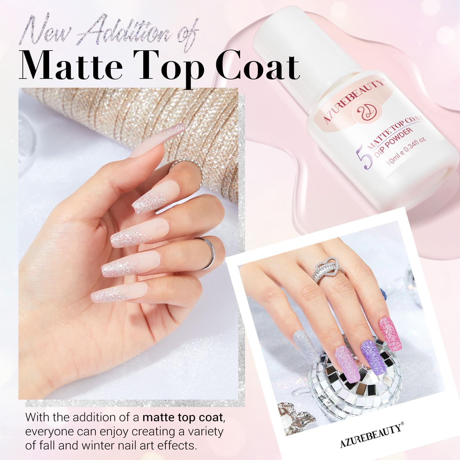 - 30 Pcs Upgraded Dazzling Starter Kit: AZUREBEAUTY 30 Pcs sparkle dip nails powder starter kit: 8*10 g (0.35 Oz) color powder, 4*10 ml dip powder liquid set(base coat/activator/top coat/matte top coat), 2*liquid brush replacement, 1*nail brush,1*nail file, 1*nail buffer, 1*dip powder recycling tray. What's more, 10*nail sticks and 2*orangewood stickers are added to the kit for color testing as well as ease of use