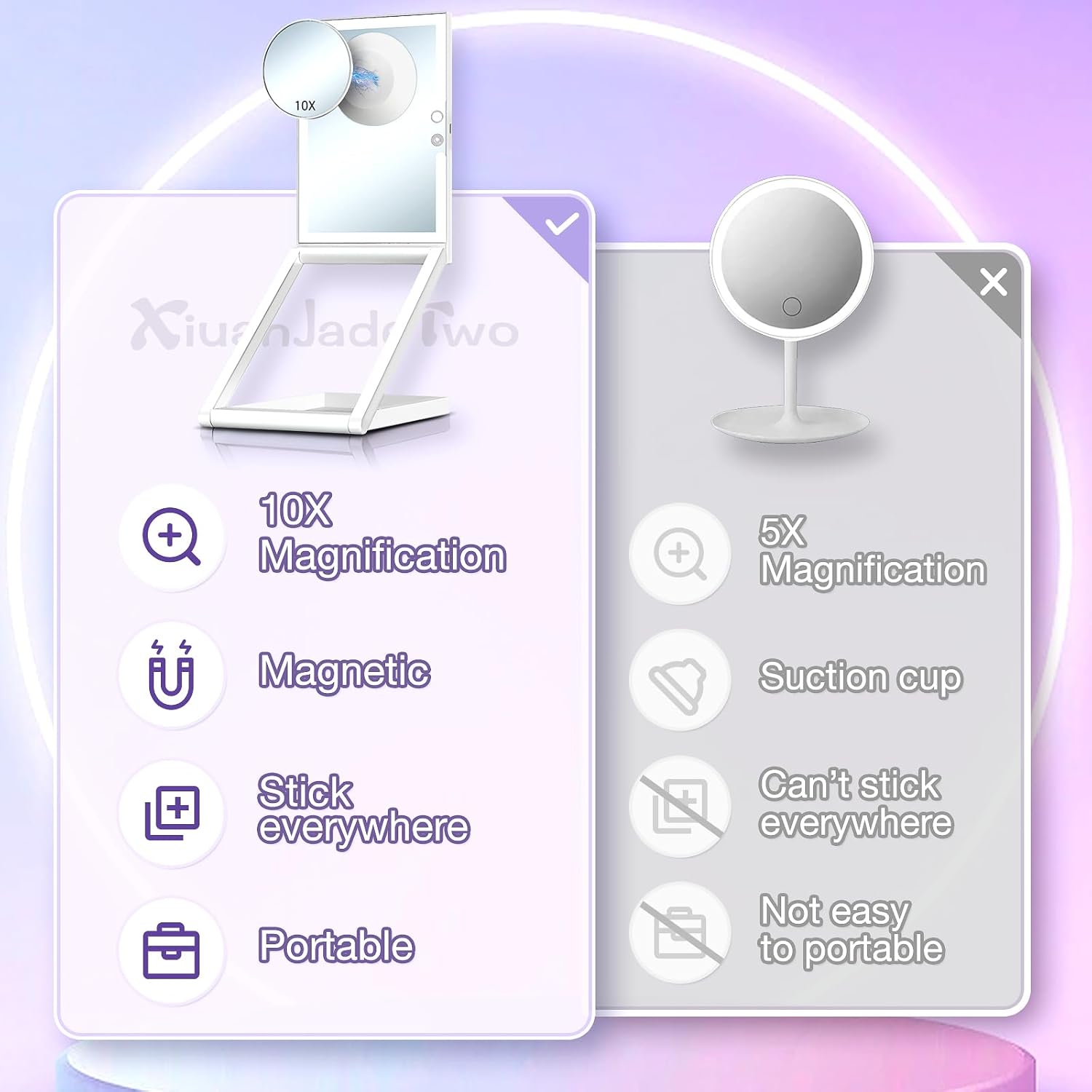 - 1X/10X MAGNIFYING MIRROR WITH LIGHT:Equipped with a 10X travel magnifying mirror to clearly focuses on facial details like wearing eyeliner, mascara etc. 1X function gives you overall makeup look to provide perfect makeup experience.