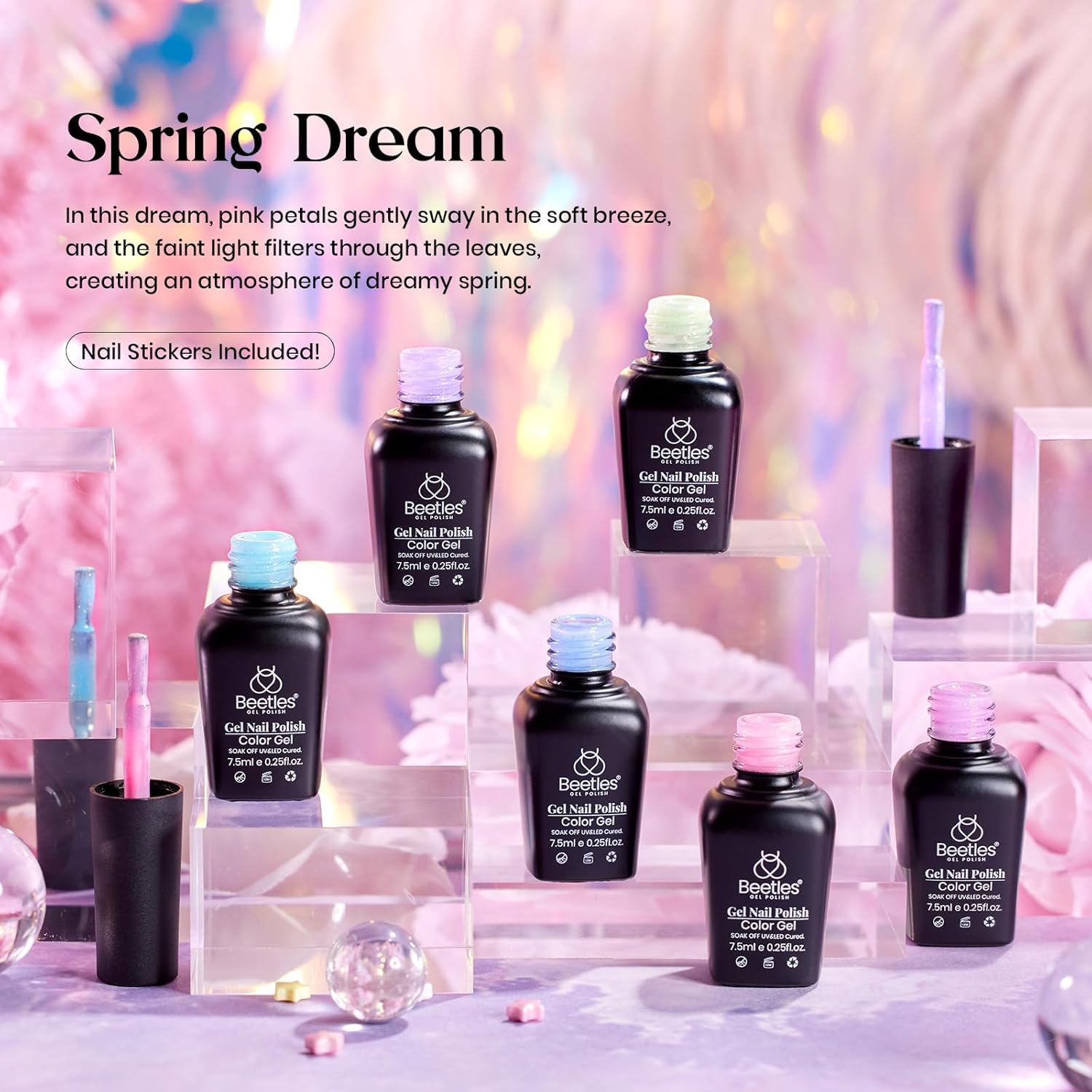 - Beetles 2024 Spring Dreaming Gel Polish Set: The package includes 6 colors 7.5ML/ 0.25fl oz gel polish with butterfly stickers. This is all-in-1 shimmer valentines day nail polish set, in this dream, pink petals gently sway in the soft breeze and the leaves creating an atmosphere of dreamy spring. Enjoy your Garden Manicure Art. Color Number: d924-d923-d922-d921-d920-d919