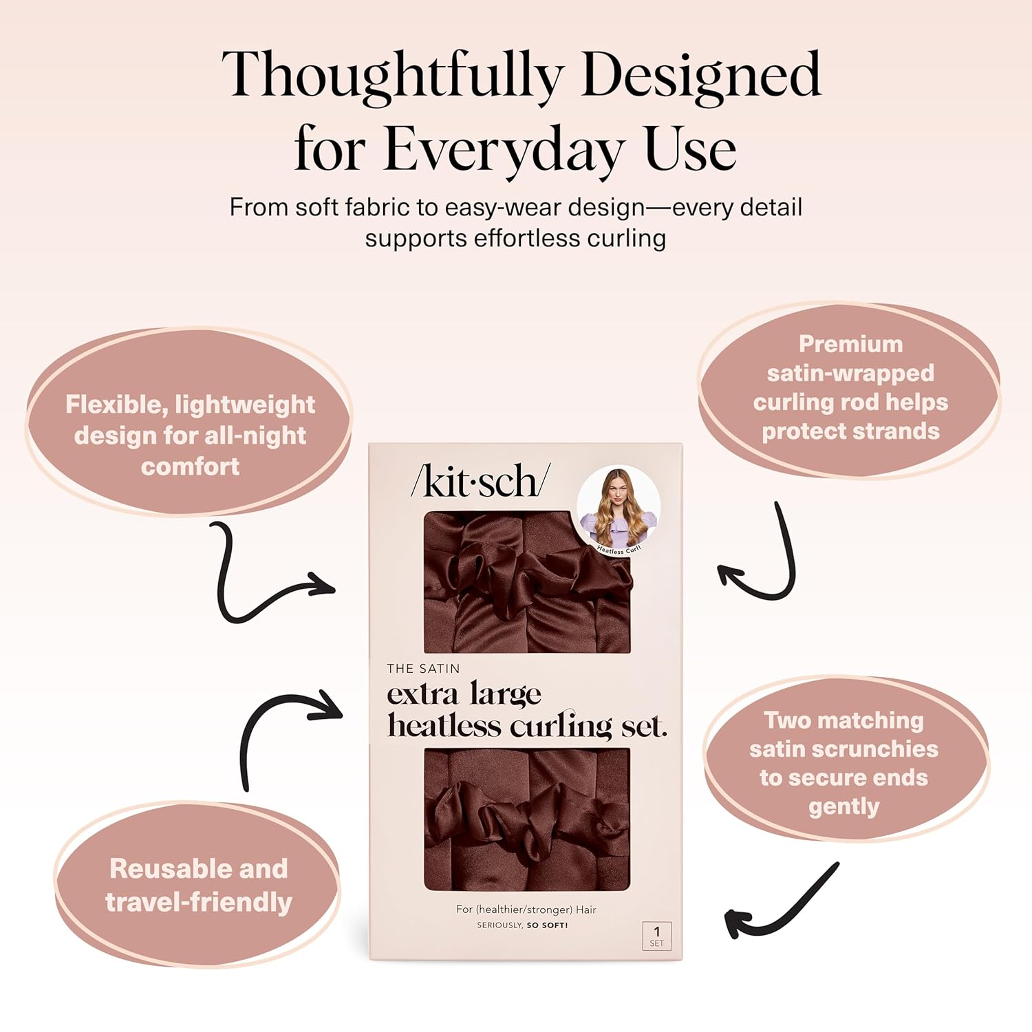 Kitsch XL Satin Heatless Curling Set – Heatless Hair Curler for Women, Hair Curler to Sleep In - with 2 Satin Scrunchies for Overnight Curls – No Heat Damage Styling with Heatless Curler - Chocolate