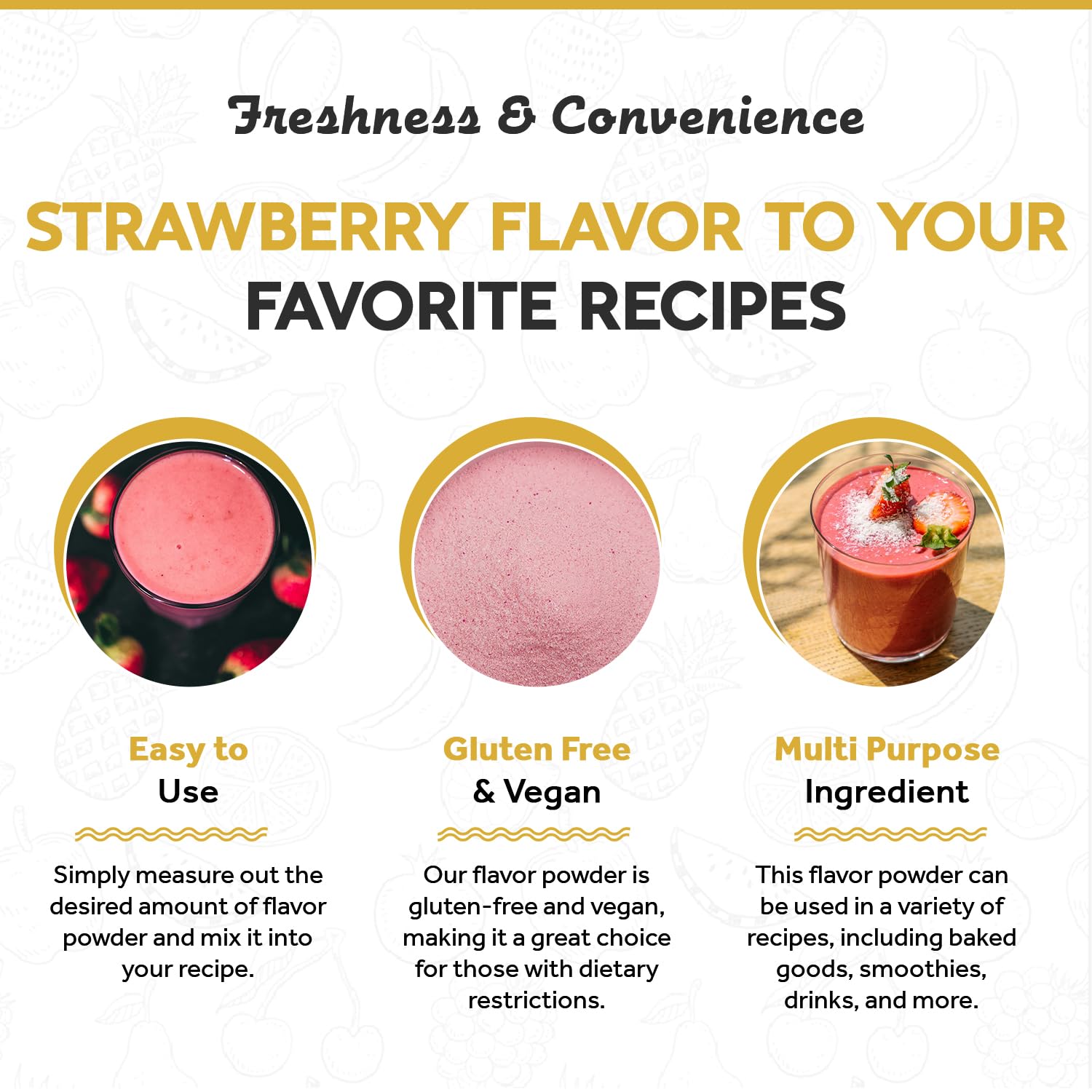 - 𝐄𝐚𝐬𝐲 𝐭𝐨 𝐮𝐬𝐞: Simply measure out the desired amount of Strawberry flavor powder and mix it into your recipe. No need to chop, grind, or blend Strawberry , as this powder provides all the nutty flavor you need in a convenient form.