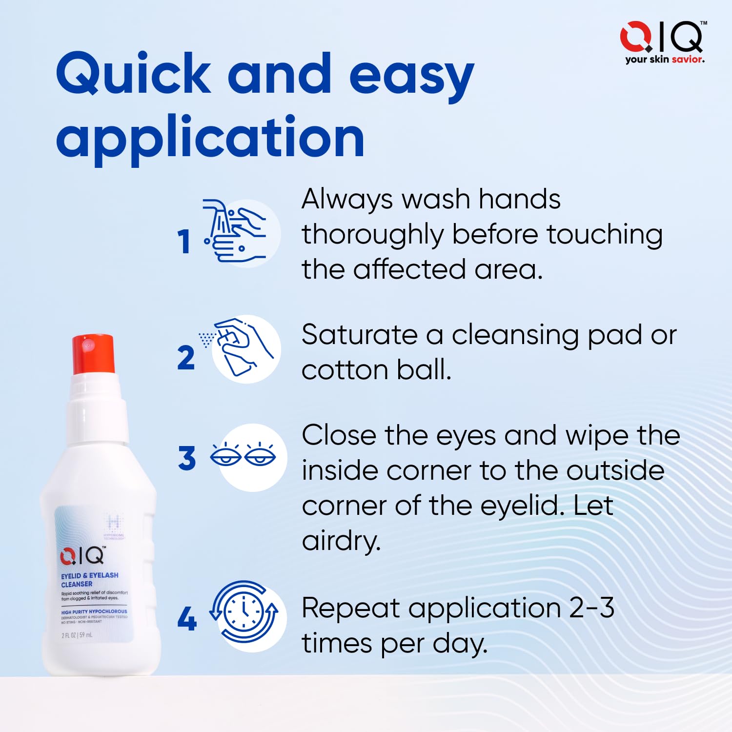 - RAPID, SOOTHING RELIEF: QIQ Eyelid and Eyelash Cleanser is a high purity hypochlorous acid spray for eyes that soothes and cares for skin without irritating it. Made for normal and sensitive skin, the eyelash cleanser brings rapid relief from discomfort caused by clogged, irritated eyes.