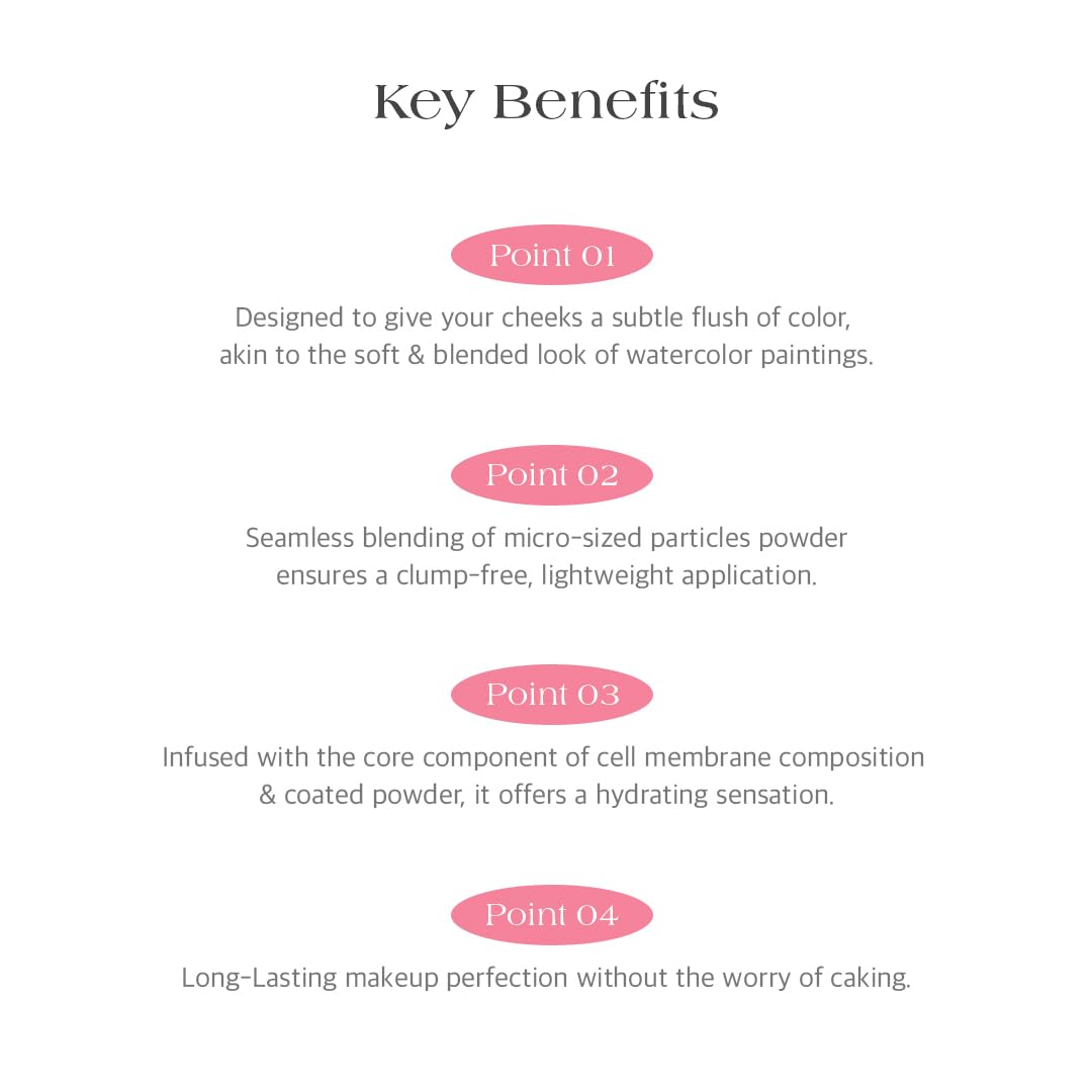 - Smooth blending - The inclusion of Lecithin-coated powder ensures smooth blending, eliminating any risk of clumping and providing a silky application experience. Additionally, micro-sized hybrid particles guarantee seamless blending, while silicone-coated powder delivers a luxuriously smooth finish.