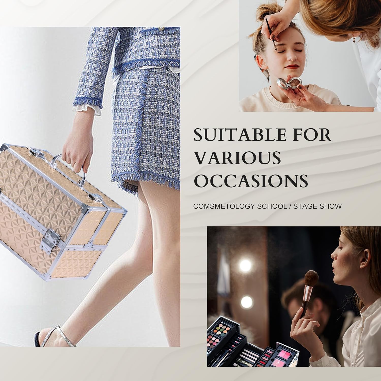 - Recyclable Gold Train Case, Large Capacity: Professional Full makeup kits comes with a large capacity train case and recyclable using. The train case organizers are a great fit for cosmetologist aesthetic supplies, nail techs, personal makeup organizer, traveling makeup box, makeup students, storage tool box and more.