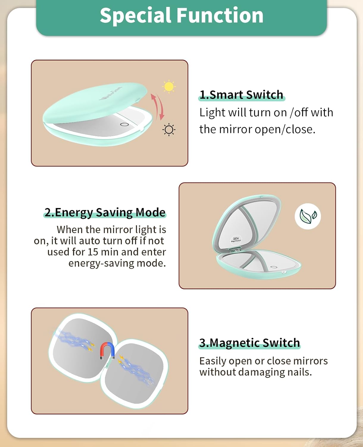 WOBSION Rechargeable Lighted Travel Makeup Mirror,1x/10x Compact Magnifying Mirror with Lights,Portable for Bag,4inch,Gift,Cyan
