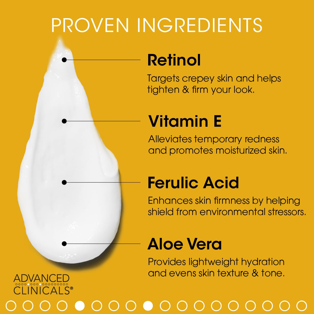 - HYDRATING & NOURISHING โ Advanced Clinicals Retinol Cream is infused with Aloe Vera, Chamomile, Glycerin, & Green Tea, which all work together to effectively firm skin + reduce the appearance of sun damaged skin, wrinkles, fine lines, & crepey skin. Aloe Vera defends against visible redness & irritation. Green Tea + Chamomile guards against environmental damage & reduces puffiness. Combination of ingredients make this Retinol Body Cream non-irritating unlike many other retinol products.