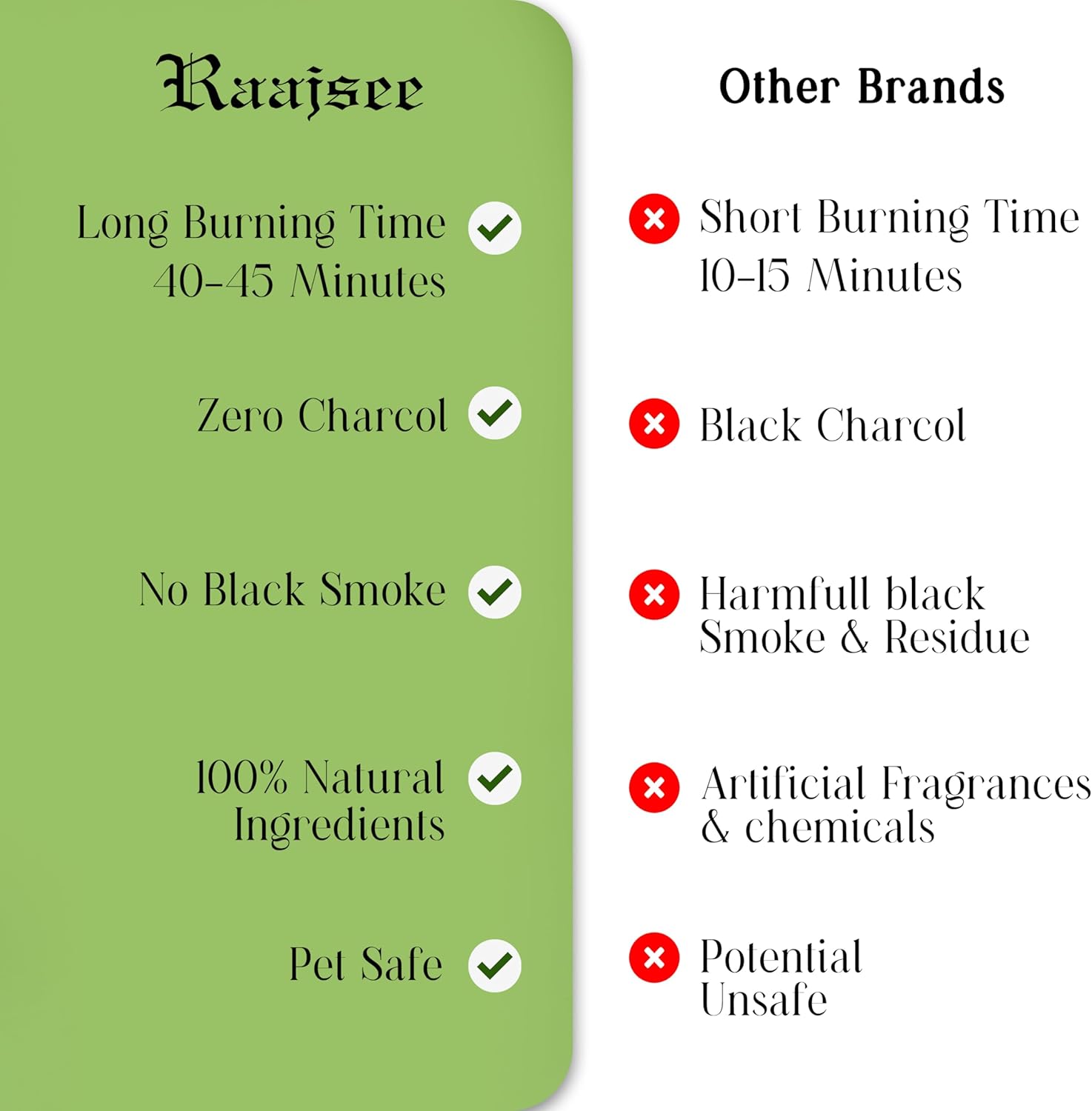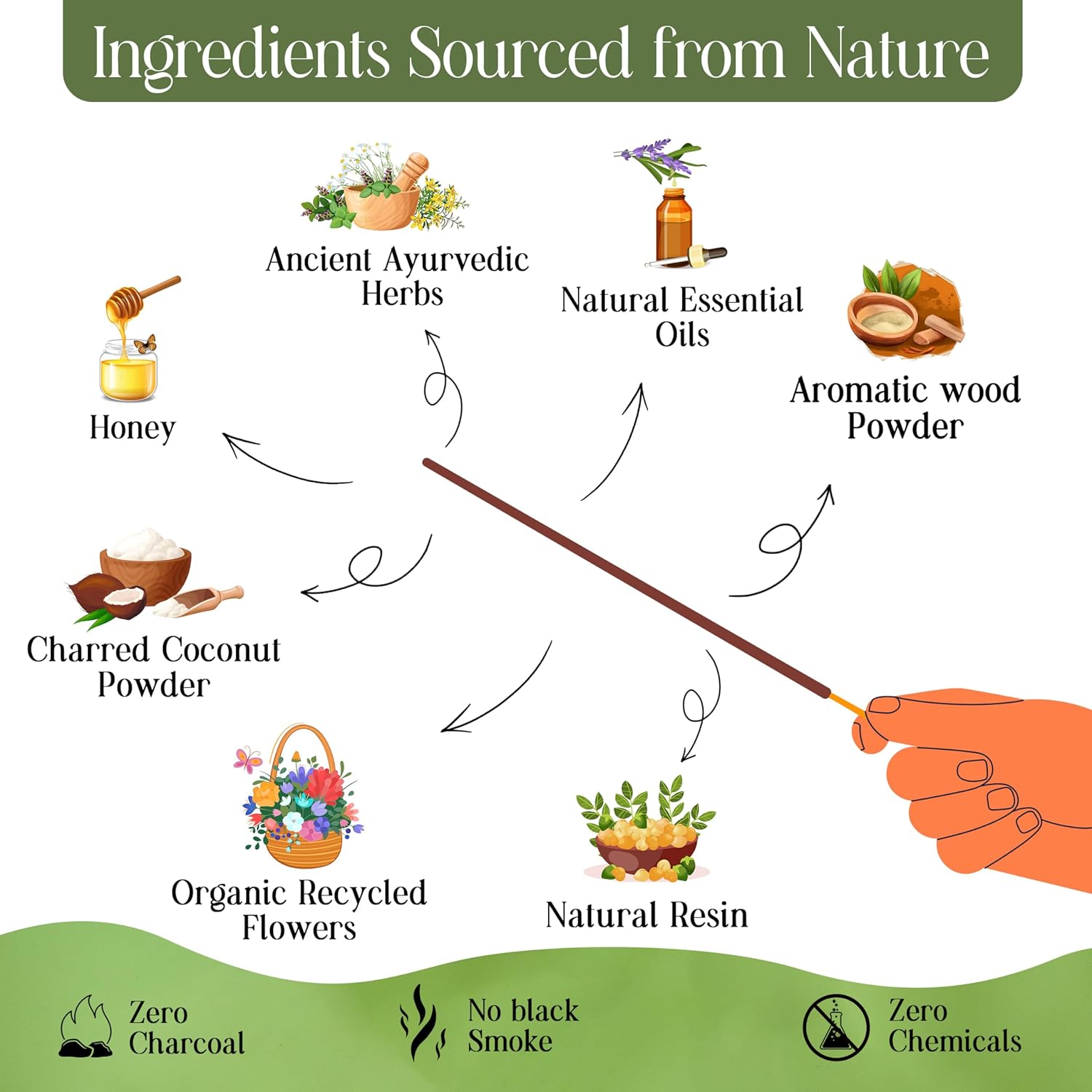 - Long-lasting Variety Pack: Enjoy 120 Organic insence-sticks with a 45-minute burn time each, plus a complimentary holder. No black smoke emission. Explore six unique fragrances from floral and herbal to woody and exotic for any mood and occasion.