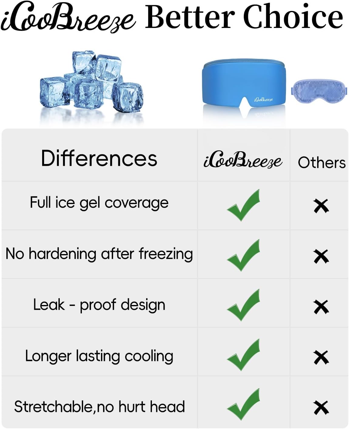 - ★WHY CHOOSE US? The iCooBreeze cooling eye mask is crafted with ultra-thick, non-toxic gel. The gel is evenly distributed, soft, and flexible—it never hardens or leaks, even after freezing. It stays cool for extended periods and is fully reusable.