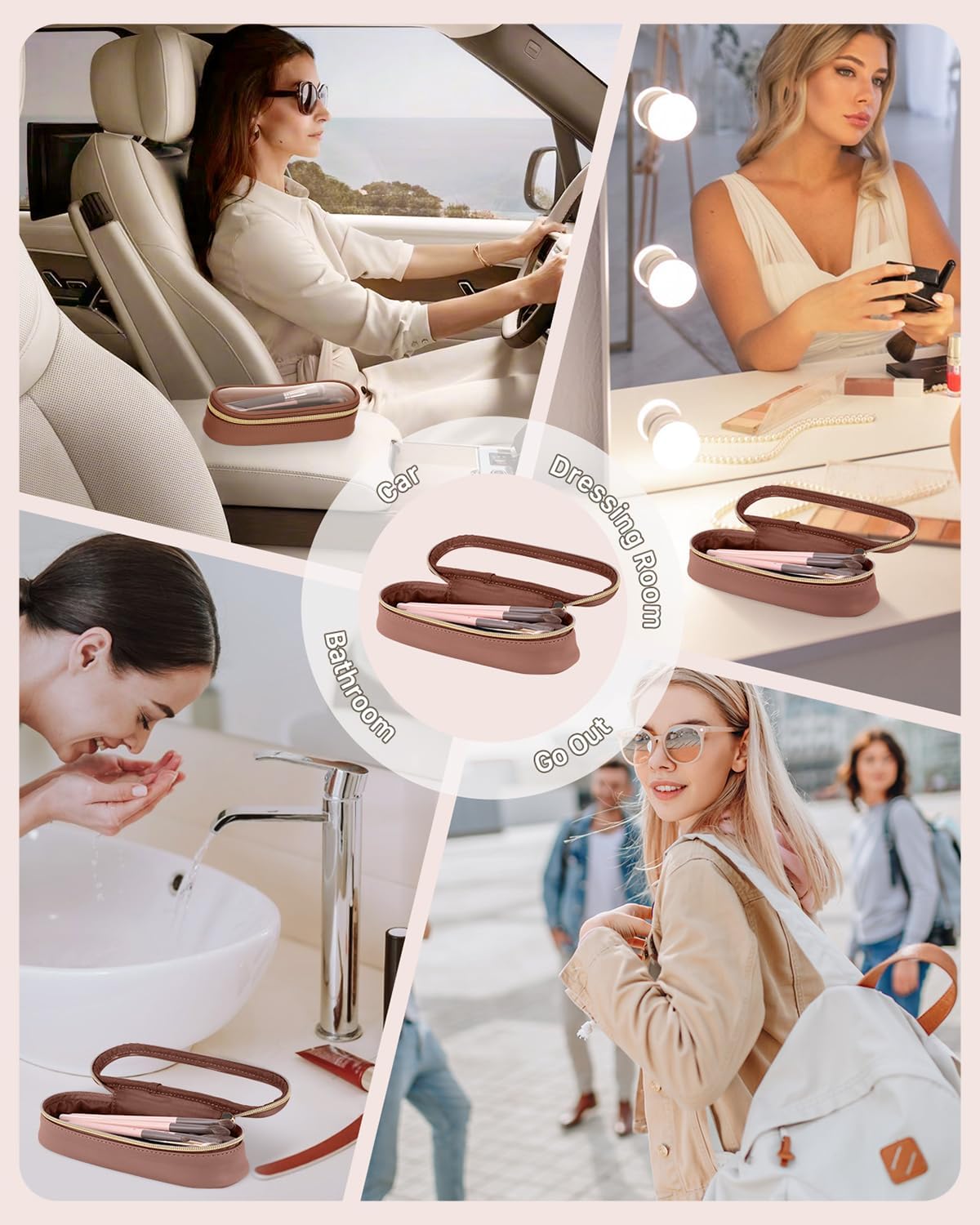 Clear Travel Makeup Brush Holder, Leather Makeup Brush Toiletry Bag, Portable Cosmetic Brush Case, Transparent Waterproof Makeup Brush Storage Bag, Brown