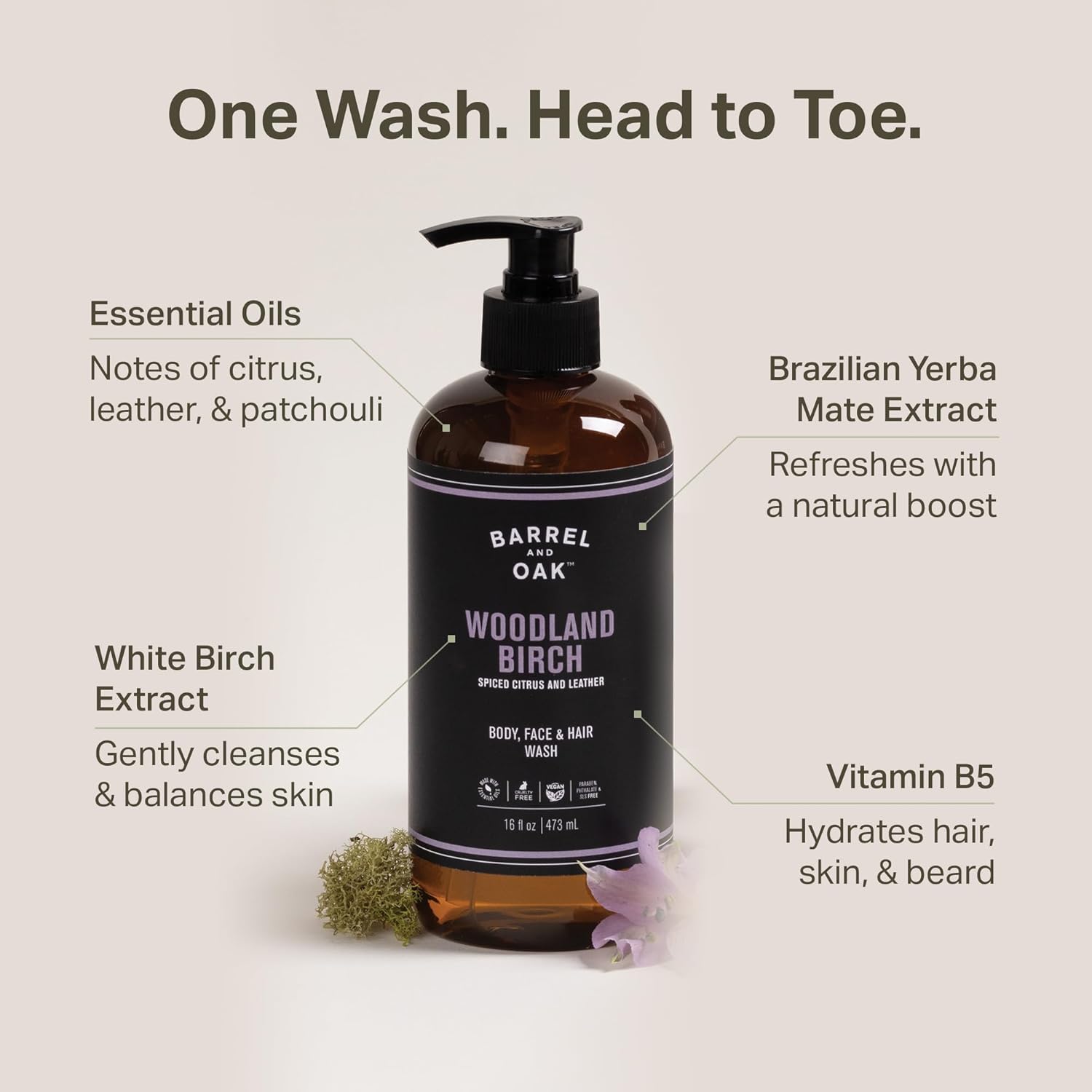 Barrel & Oak All-in-One Wash for Face, Hair, & Body, Vegan & Hydrating Face, Shampoo and Body Wash for Men, Grooming Kit Gifts for Men, Woodland Birch, 16 oz