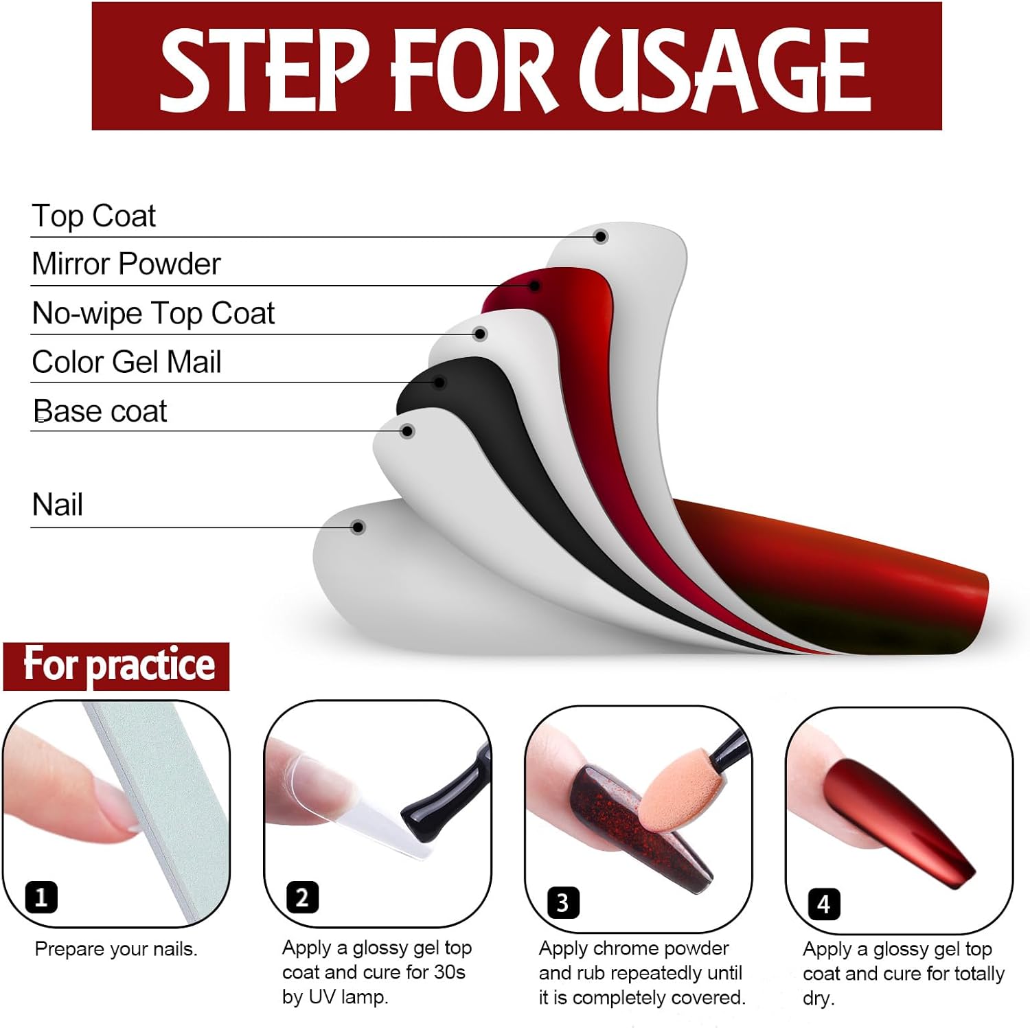 - 【PACKAGE CONTENTS】:16 pcs(each 1gram) Artdone Chrome Nail Powder, 6 for white based chrome nail mirror pigment powders, 7 for mirror chrome powder, 3 for holographic nail powder. They needs to be used with gel nail polish and no wipe top coat.