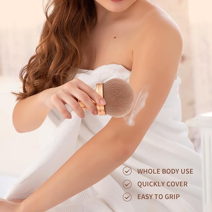 - EXTRA-LARGE MAKEUP BRUSH: Oversized, 74mm oval-shaped brush head allows for efficient coverage, Can quickly get uniform, seamless and beautiful makeup effects. Perfect brush for leg, arm, collarbone, cheek makeup and back tanning applicator.