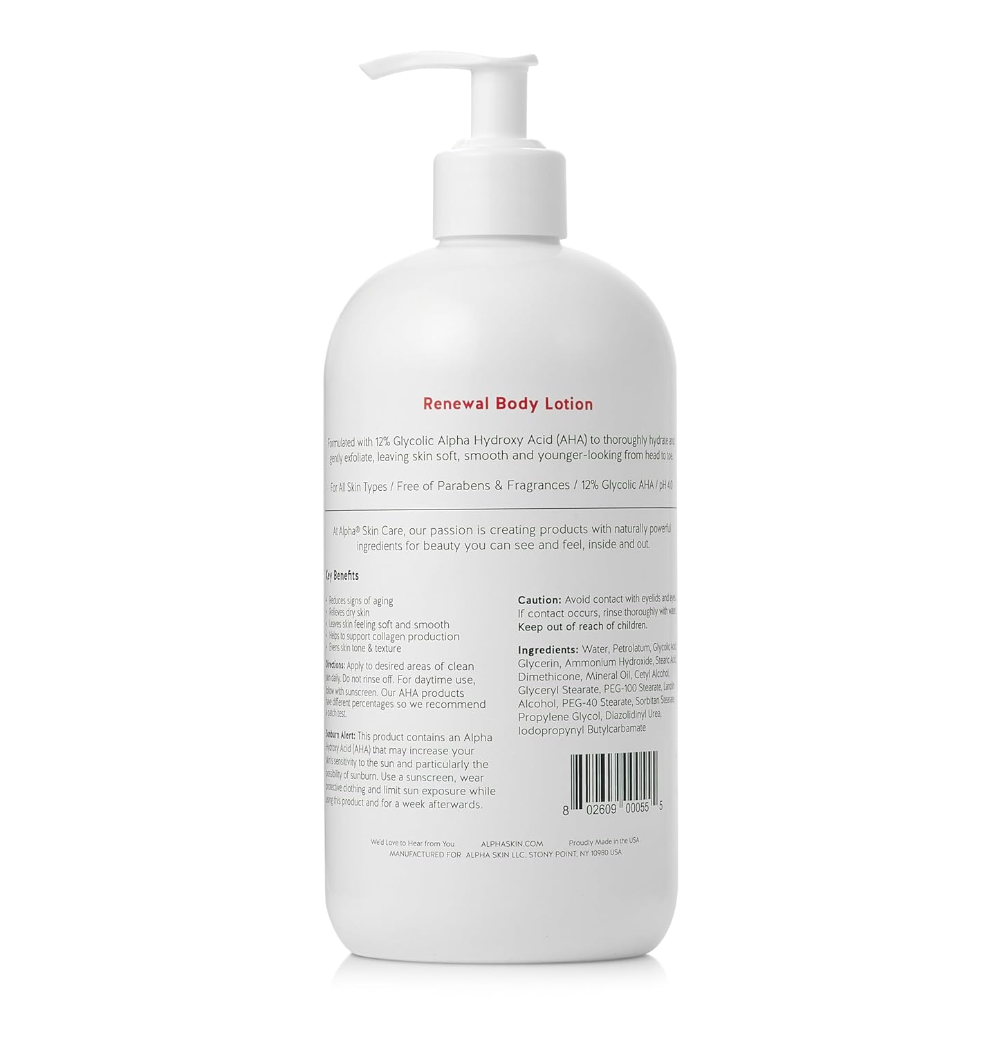 - Anti-Aging Formula: This body lotion is formulated with 12% Glycolic Alpha Hydroxy Acid (AHA) and a pH level of 4.0 to help reduce the appearance of fine lines and wrinkles. AHA promotes skin renewal by encouraging cell turnover, improving elasticity, and smoothing skin texture. Ideal for those looking to hydrate while gently exfoliating, this lotion helps restore a youthful appearance. Regular use supports collagen production, leaving skin feeling firmer, softer, and more radiant over time.