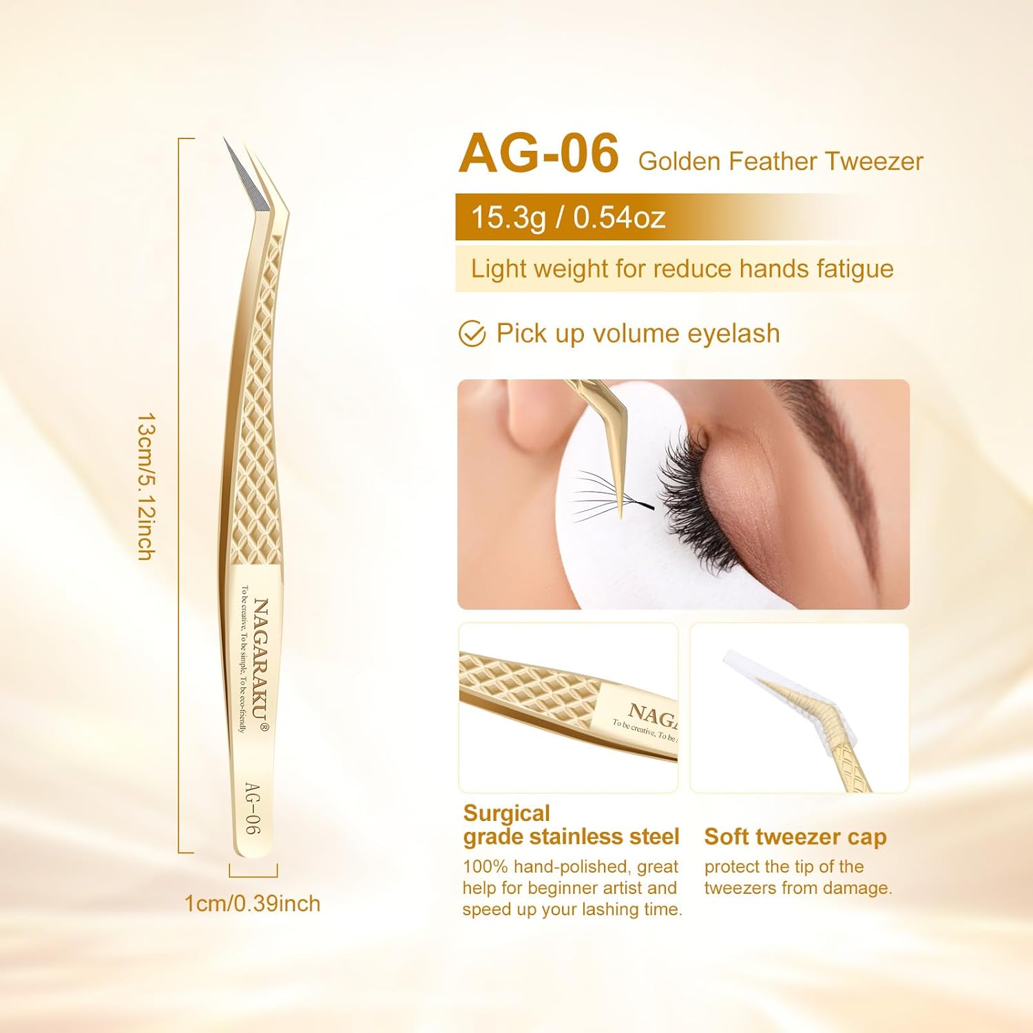 - Curved Tweezers AG-06: Colour: Gold / Length: 5.04 inches; Width: 0.39 inches. These handcrafted tweezers are made of high-strength stainless steel, which is resistant to most acids and other corrosive agents. We give each tweezer a box to protect the tweezers