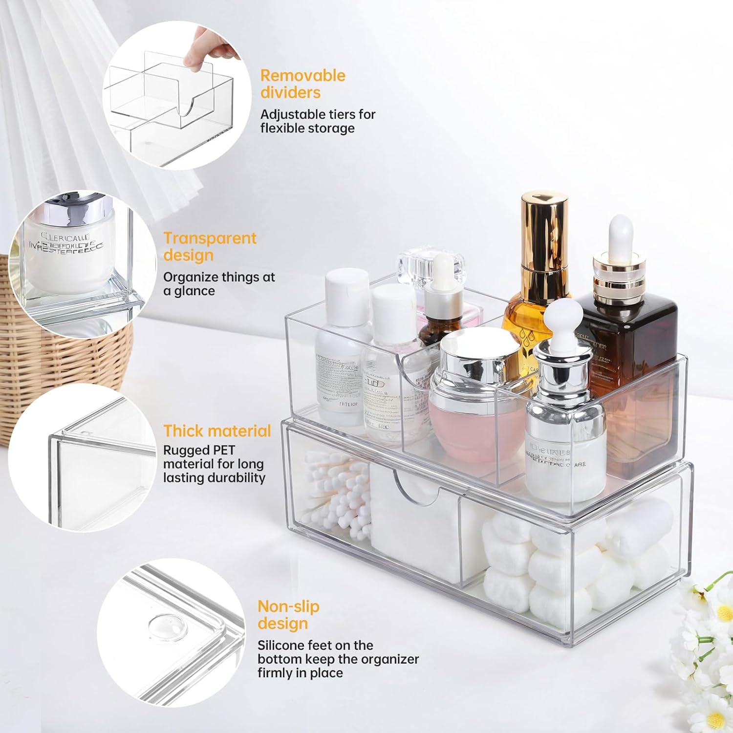 Medicine Cabinet Organizer 2 Pack, Stackable Storage Drawers with Removable Divider, Make Up Organizer for Bathroom Mirror Cabinets, Vanity, Closet, Countertop - Clear