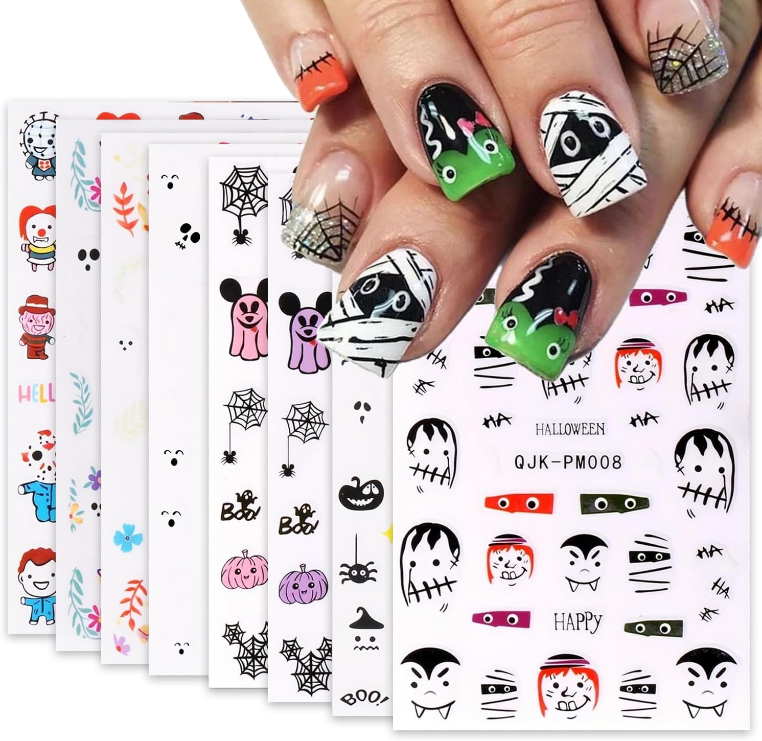 Halloween Nail Art Stickers 8 Sheets Cute Ghost Pumpkin 3D Self-Adhesive Nail Decals Q-Version Horror Movie Characters Skull Spider Web Nail Decorations Fall DIY Nail Supplies for Women Girls&Kids