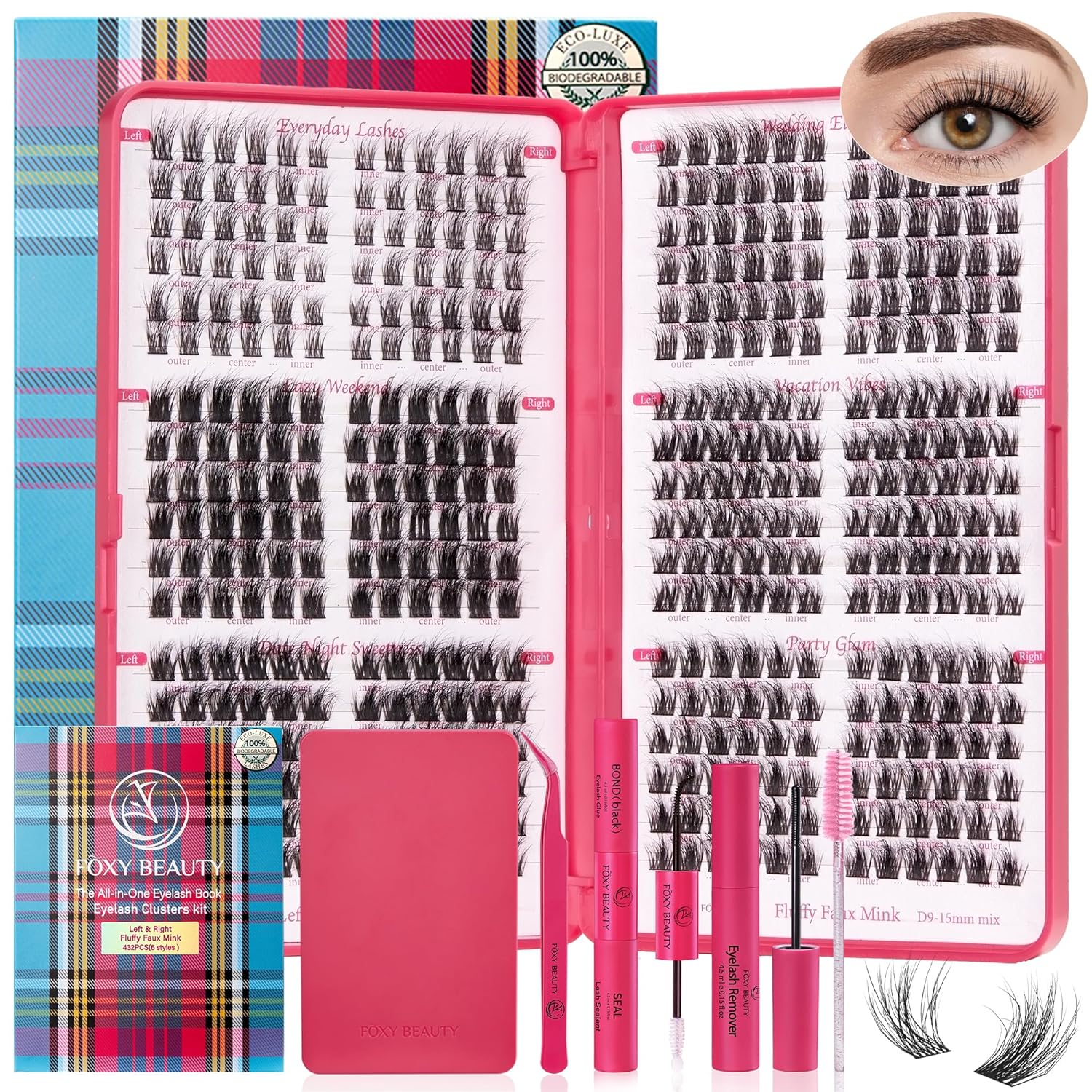 Lash Clusters Kit - 0.05mm Lash Clusters Natural & Fluffy Lash Extension Kit 432Pcs Biodegradable Eyelash Clusters with Bond Seal Starter Kit, Cruelty Free Eyelashes Lightweight Reusable