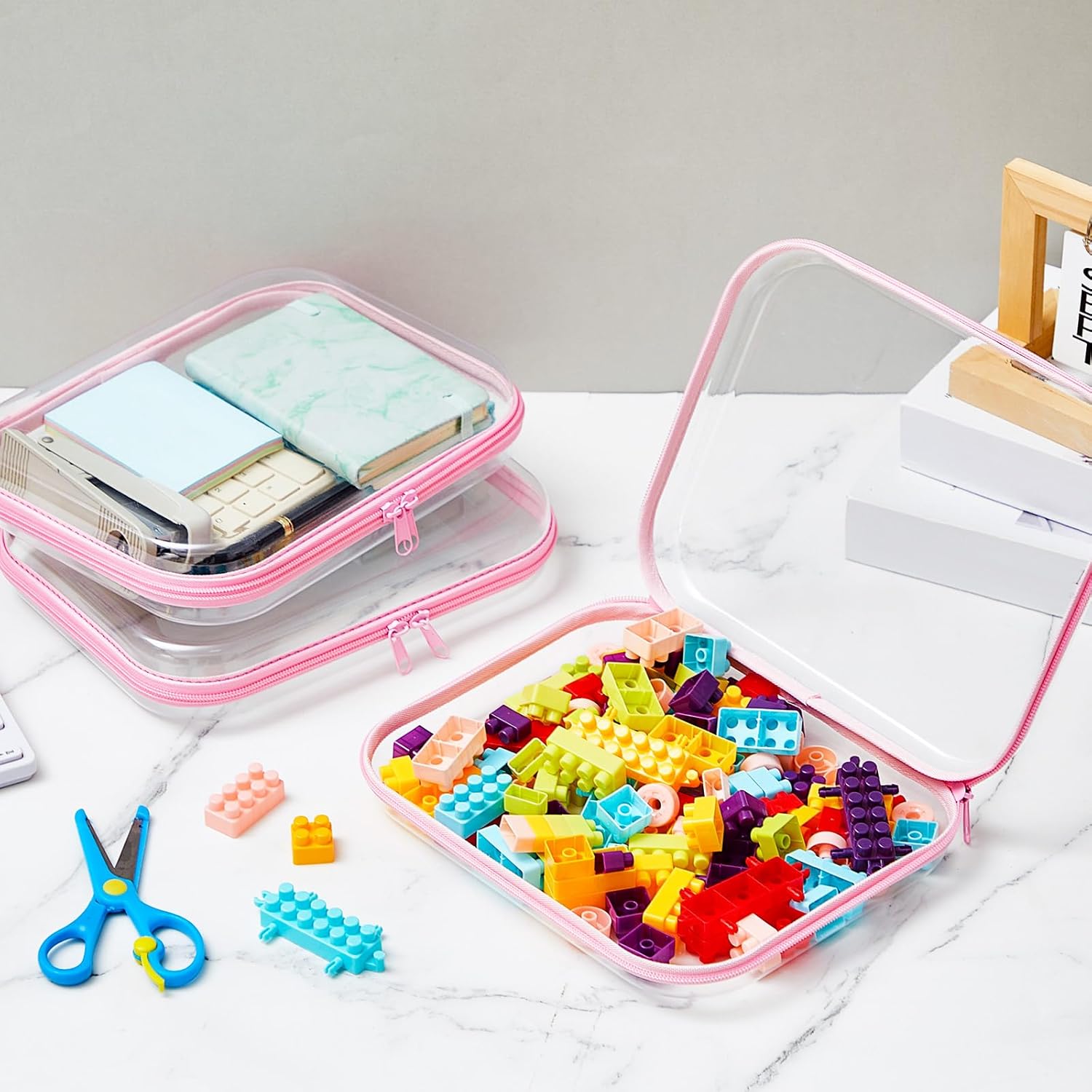 Hoolerry 3 Pcs Clear Hard Zipper Case Plastic Pouch Transparent Hard Case Clear Makeup Bag Portable Travel Organizer Bin for Cosmetics, Building Blocks, Puzzles(Pink,M)