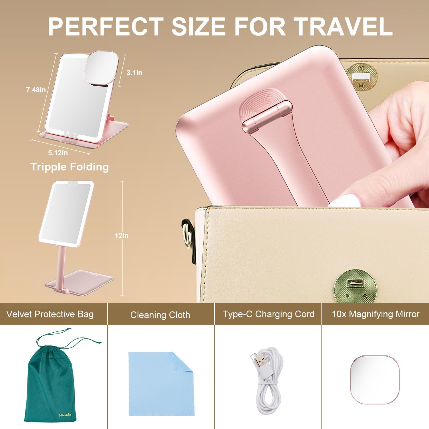 - ✔️【Portable For Carrying】Professional Travel Design Size: 8x6 Inches, only 0.6 Inch when folded, slim design, with velvet storage bag, easy to carry in handbag, backpack, luggage. Whether you are travelling, party or business trip, Mocado Travel Makeup Mirror is perfect for you.